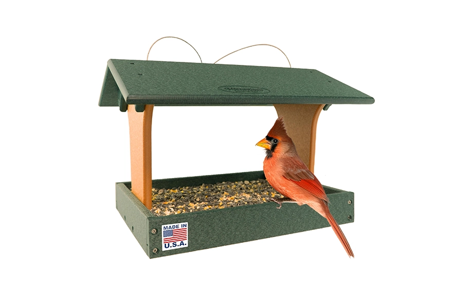 DutchCrafters Amish USA Made Recycled Plastic Large Hanging Modern Fly Through Covered Roof Open Platform Tray Bird Feeder for Outdoors, Garden, Yard (Turf Green & Bright Cedar)(Turf Green & Bright Cedar)