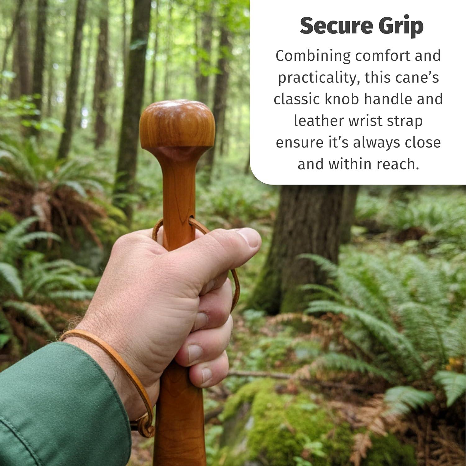 Leather Wrist Strap: Enhancing convenience and security, the attached leather wrist strap provides a comfortable grip. This feature ensures that the wood cane remains within reach, offering peace of mind during walks.