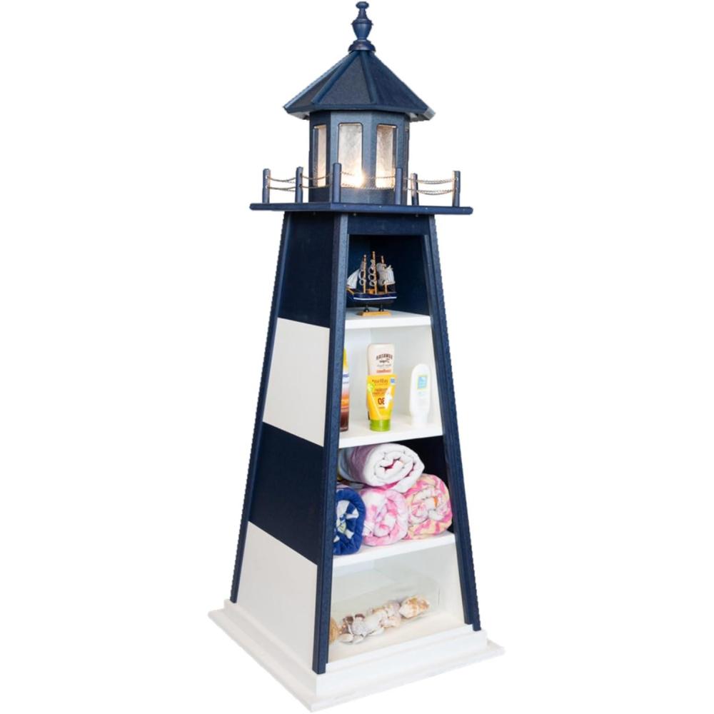imageDutchCrafters 5 Foot Nautical Poly Lighthouse Bookshelf with Functional Storage and Working Light  Coastal Decor Beach Themed Bookcase for Shoes Towels Sunscreen Outdoors Gray ampamp Light GrayPatriot Blue  White