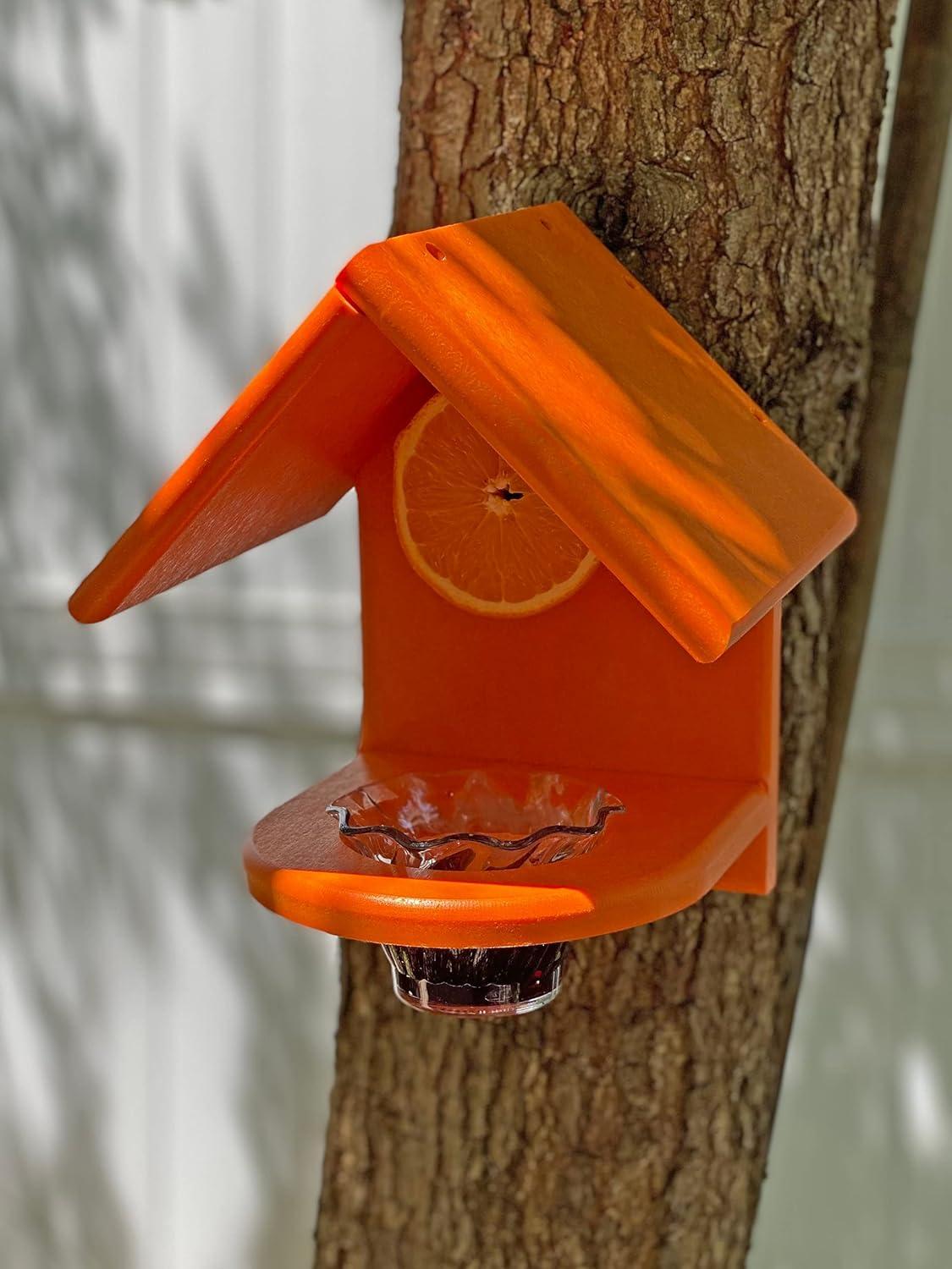FEEDER FEATURES: This oriole bird feeder for outdoors contains a removable jelly cup for easy cleaning and jelly, seeds, or mealworm refilling. It contains a rod for orange halves that orioles love. Crafted in bright orange to attract orioles!