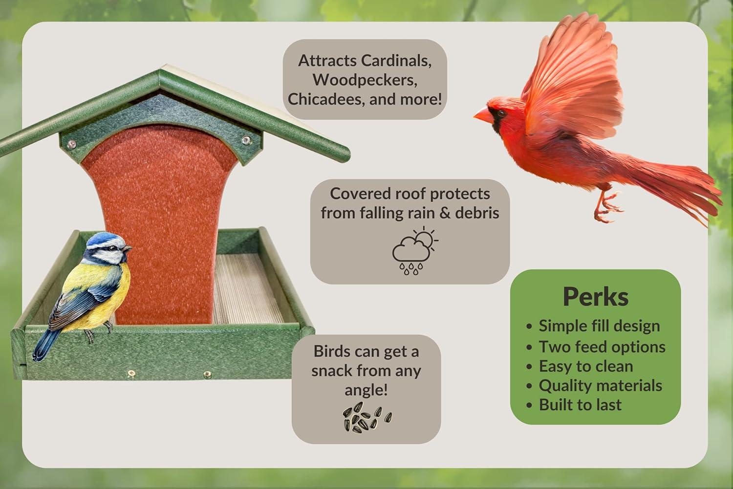 DutchCrafters Fly by Plastic Poly Post Mount Bird Feeder with Covered Roof for Wild Birds - Durable, All Weather Birdfeeder Tray for Outdoors (Tudor Brown & Weathered Wood)(Turf Green & Cherry Wood)