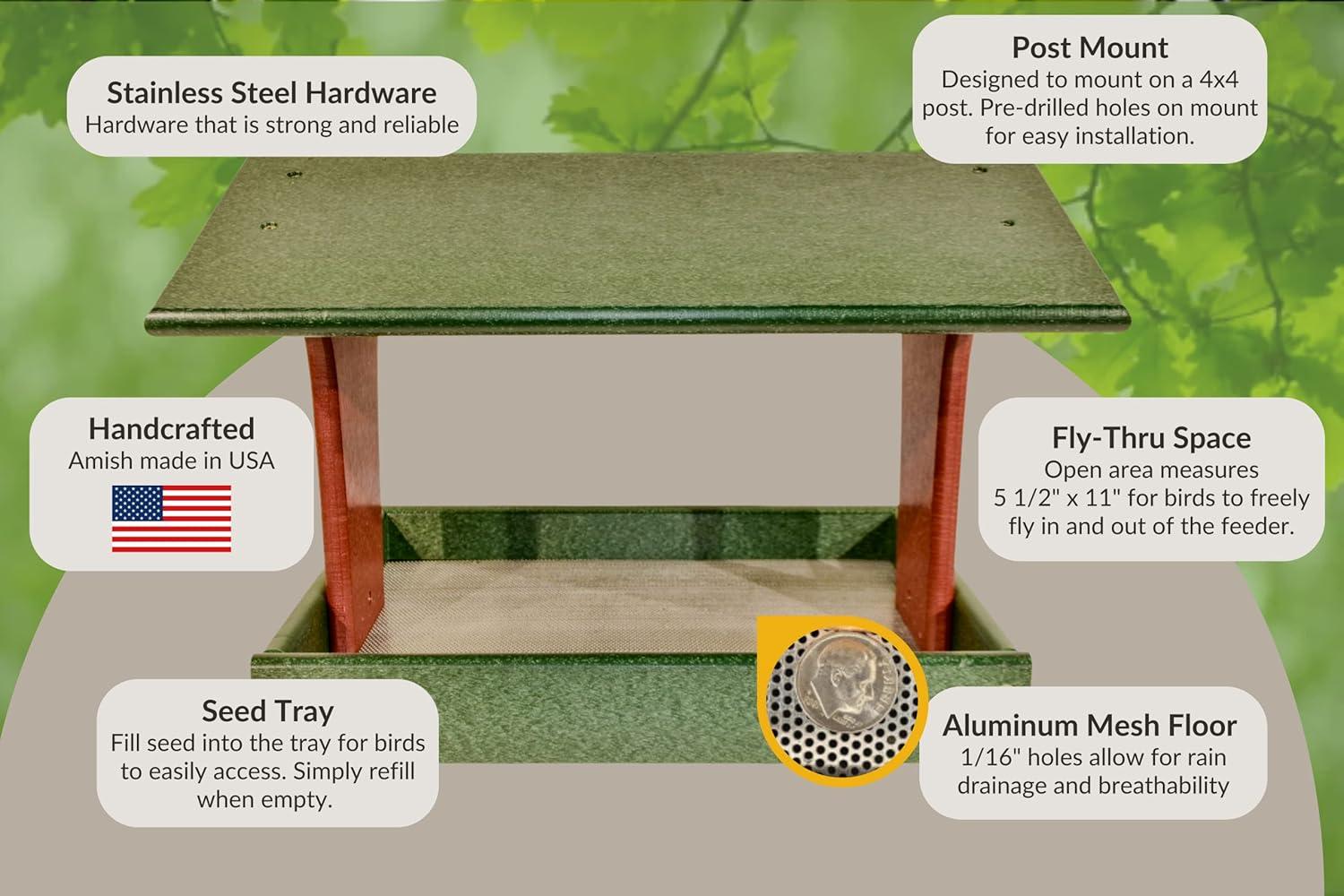 Features: Pre-Drilled Holes for Easy Mounting onto 4×4 Post, Stainless Steel Hardware Used Throughout. 1/16″ Diameter Aluminum Mesh Tray to Allow Airflow and Drainage without Losing Seed, Covered Roof to Protect Feeder