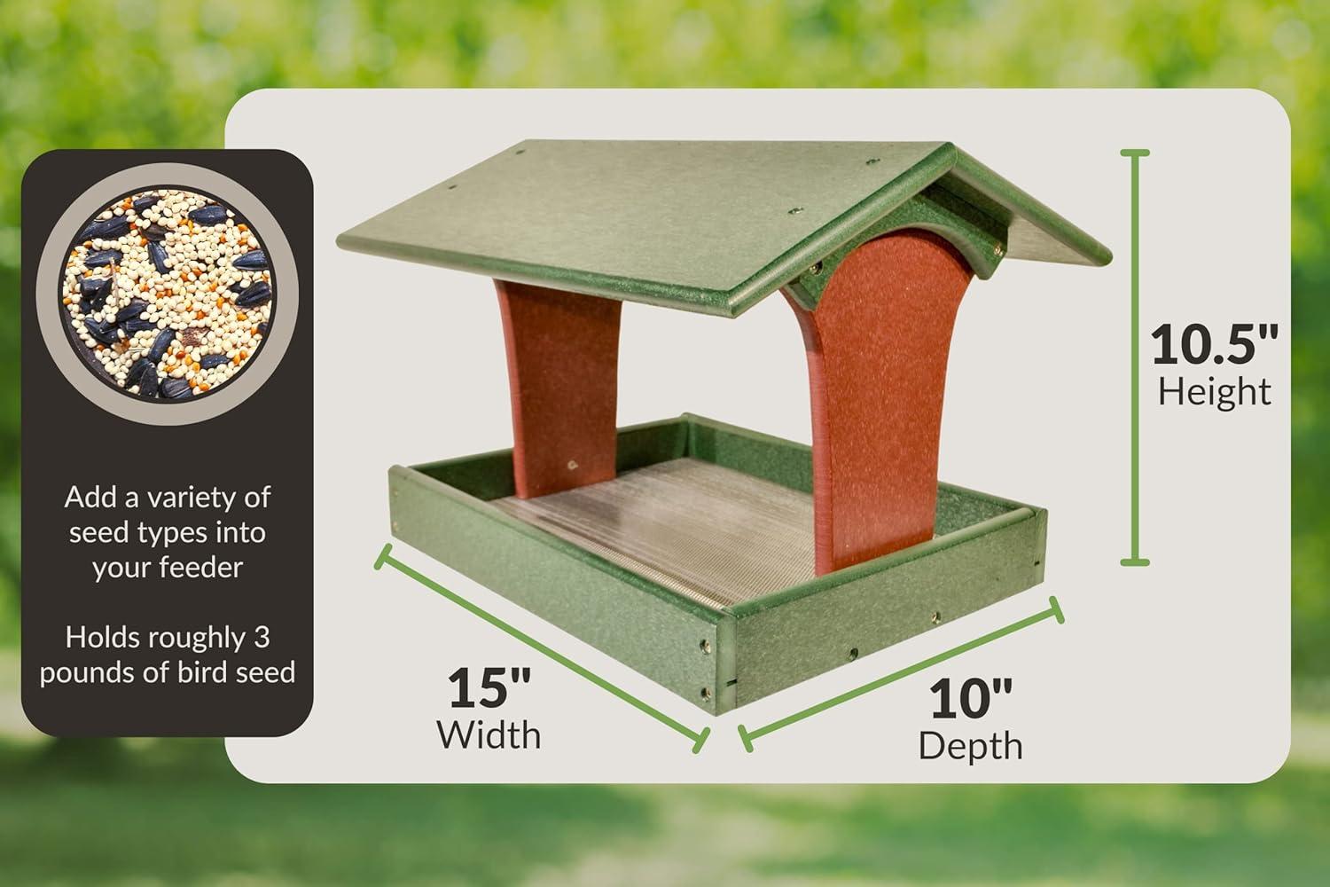 Dimensions: 15″ Width x 10″ Depth x 10.5″ Height, 5.5 lbs. Feeder Holds Approximately 1-3 Pounds of Food Depending on Seed Type. Large and Open Design Allows Birds to Fly Through for a Quick Snack
