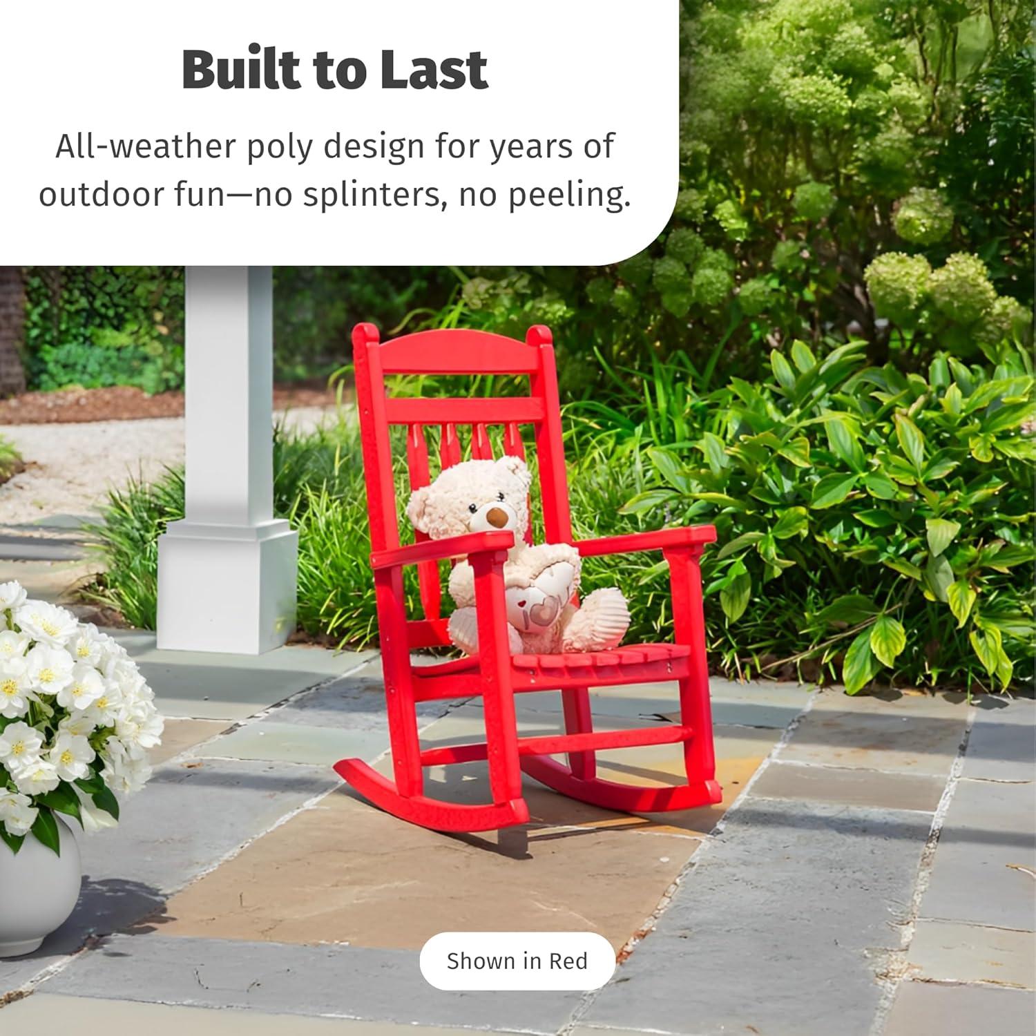 Enjoy Indoors or Outdoors – Whether brightening up a bedroom, nursery, or covered patio, this kids rocker chair comes in 15 vibrant colors to match any style. This durable toddler chair works perfectly as an indoor rocking chair or as kids outdoor furniture for patios and play spaces.