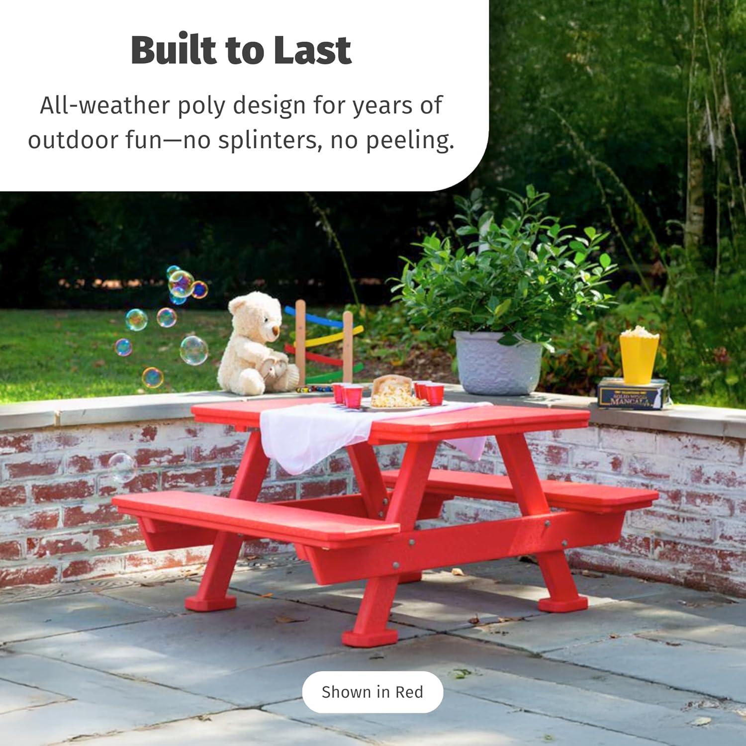 Kids Picnic Tables for Outdoors – Sized just right for kids ages 2–7, this small picnic table measures 20″ high with a spacious 36″W x 22.5″D tabletop. The low-profile design makes this kids play table easy for little ones to sit and stand on their own. This picnic table for kids is perfect for outdoor playtime, meals, or crafts on your backyard, patio or lawn.