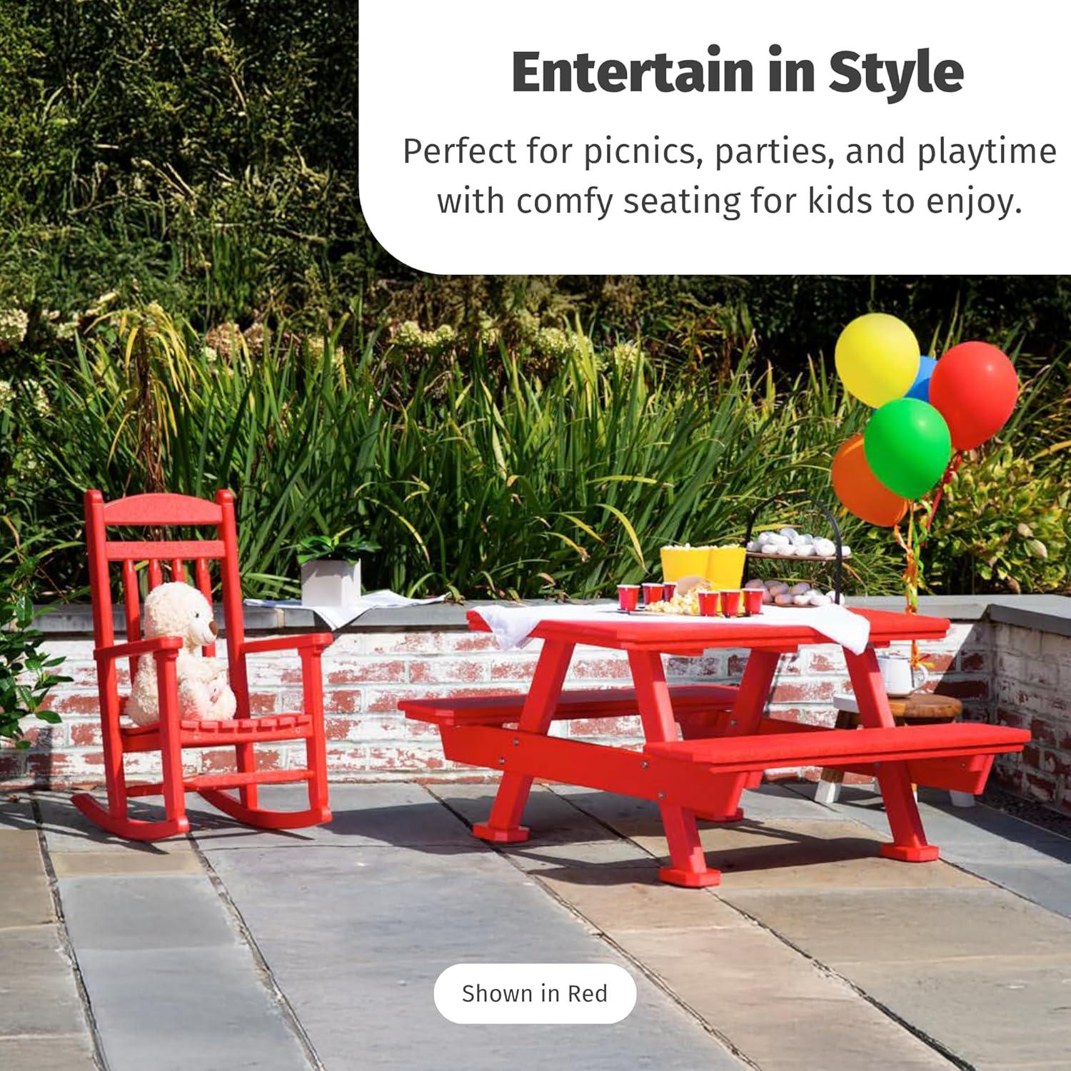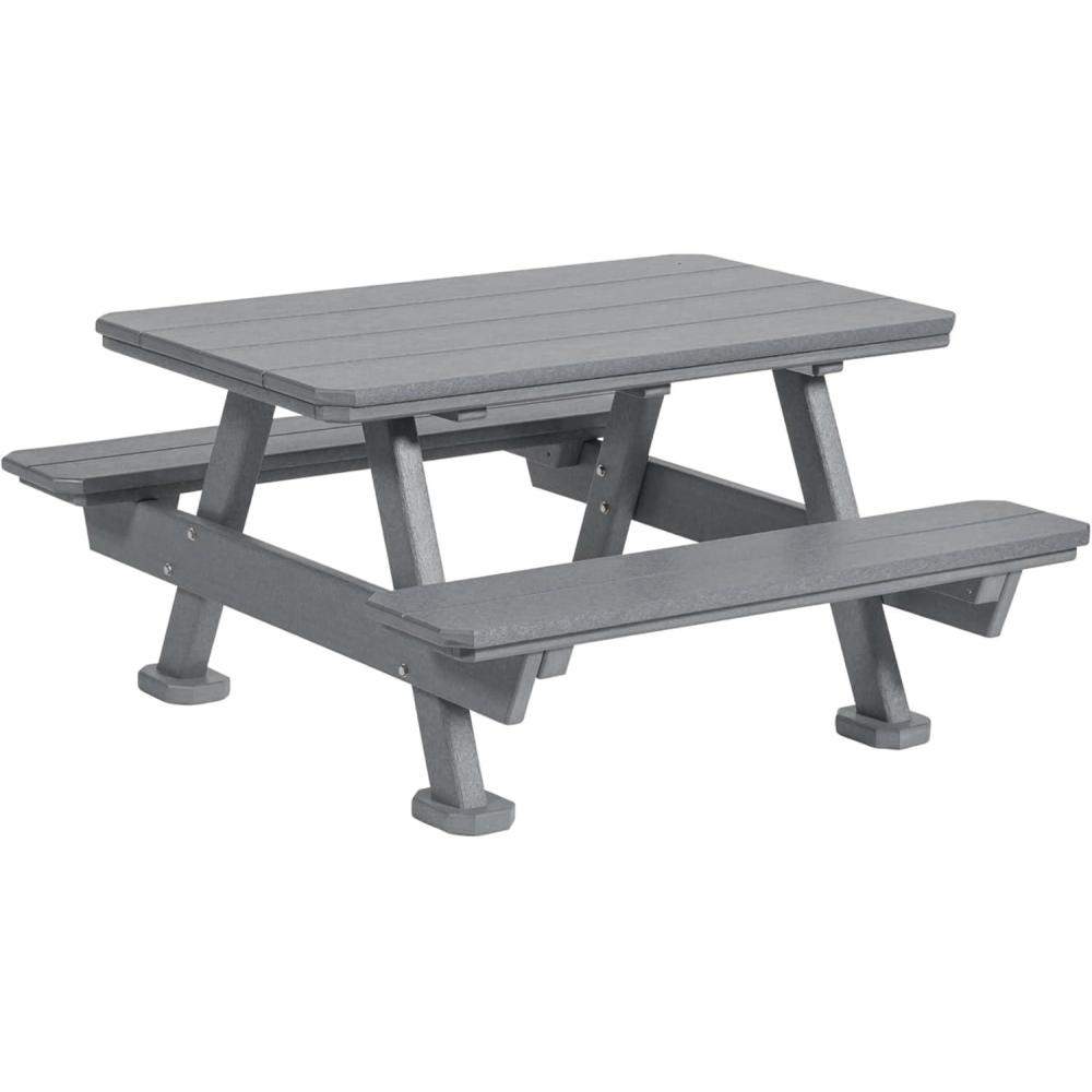 Enjoy endless outdoor fun with this Amish handcrafted kids’ plastic picnic table! Measuring 42″D x 36″W x 20″H, with a spacious 22.5″D x 36″W tabletop, this picnic table for kids 2-5 creates a safe, comfortable space where your children can eat, play, create, and make lasting memories outside. Handmade in the USA by skilled Amish artisans, this toddler picnic table combines traditional quality craftsmanship with sustainable practices and eco-friendly recycled HDPE poly lumber. Unlike typical plastic or flimsy outdoor furniture, this childrens picnic table is built to last—resisting fading, cracking, warping, and weather damage from sun, rain, or snow all year-round. Weighing 65 lbs, this small camping table is durable and heavy enough to stay stable during active play but easy enough to move when needed. The outdoor picnic tables smooth, non-porous surface wipes clean effortlessly with just soap and water, making cleanup quick and hassle-free—perfect for busy parents dealing with spills and messy projects. Designed with safety and durability in mind, this kid picnic table offers a sturdy, wobble-free seat that keeps up with energetic kiddos. Its classic design fits beautifully in any backyard, patio, or play area, adding both function and style to your existing poly outdoor furniture. Choosing this American made, heavy duty picnic table means investing in quality kids outdoor furniture made with care, recycled materials, and eco-conscious manufacturing. This outdoor toddler table offers long-lasting value and timeless appeal, far superior to the mass-produced plastic picnic tables found in big box stores. Create a special spot for your kids with a place to gather, create, and make memories year after year. Bring home this weatherproof, kids’ rectangular table and enjoy peace of mind knowing you’ve chosen a safe, durable, and eco-friendly option for your family’s outdoor adventures.
