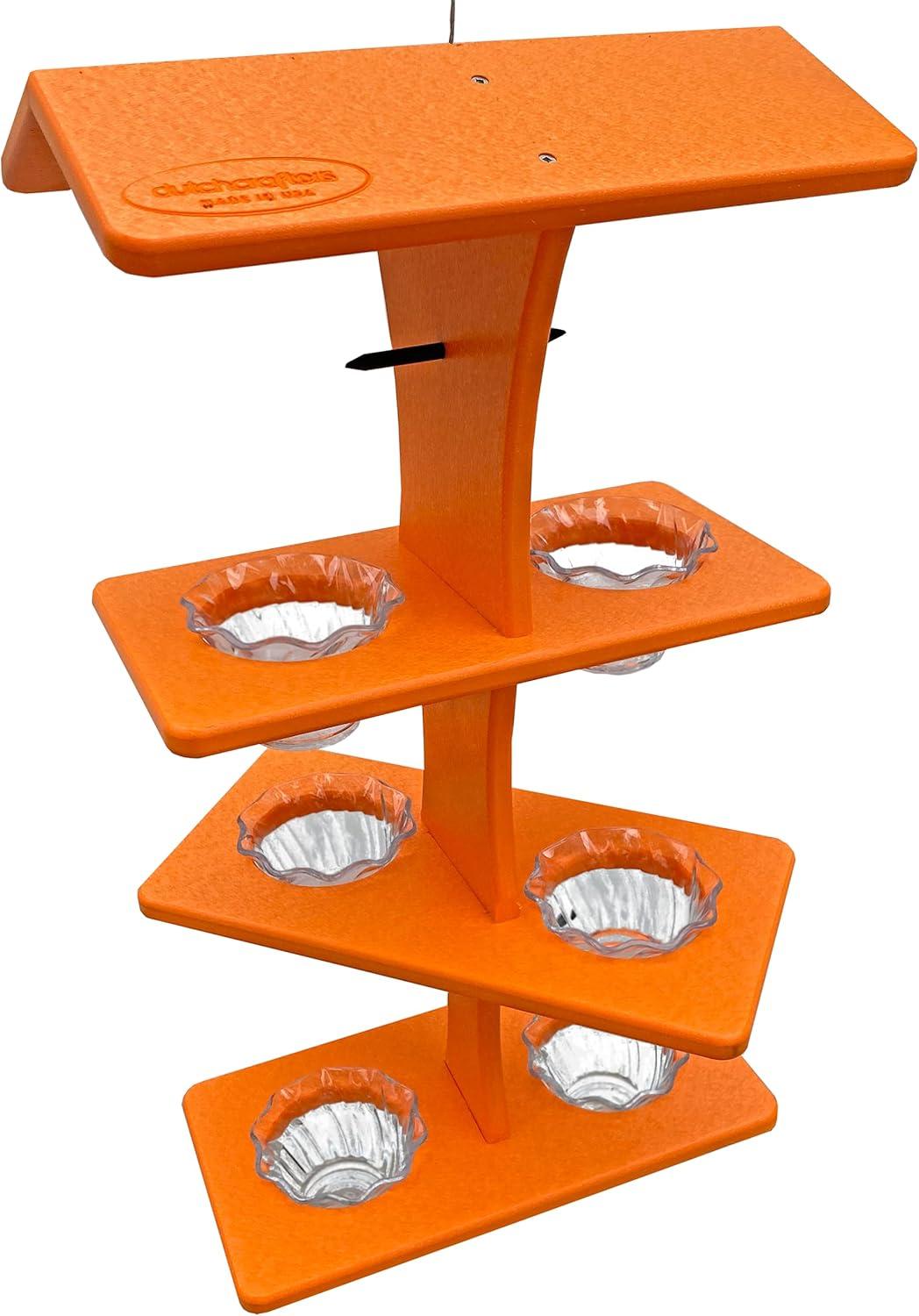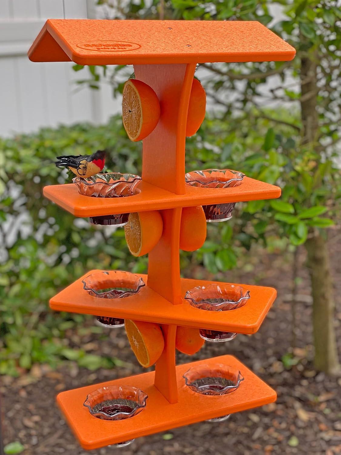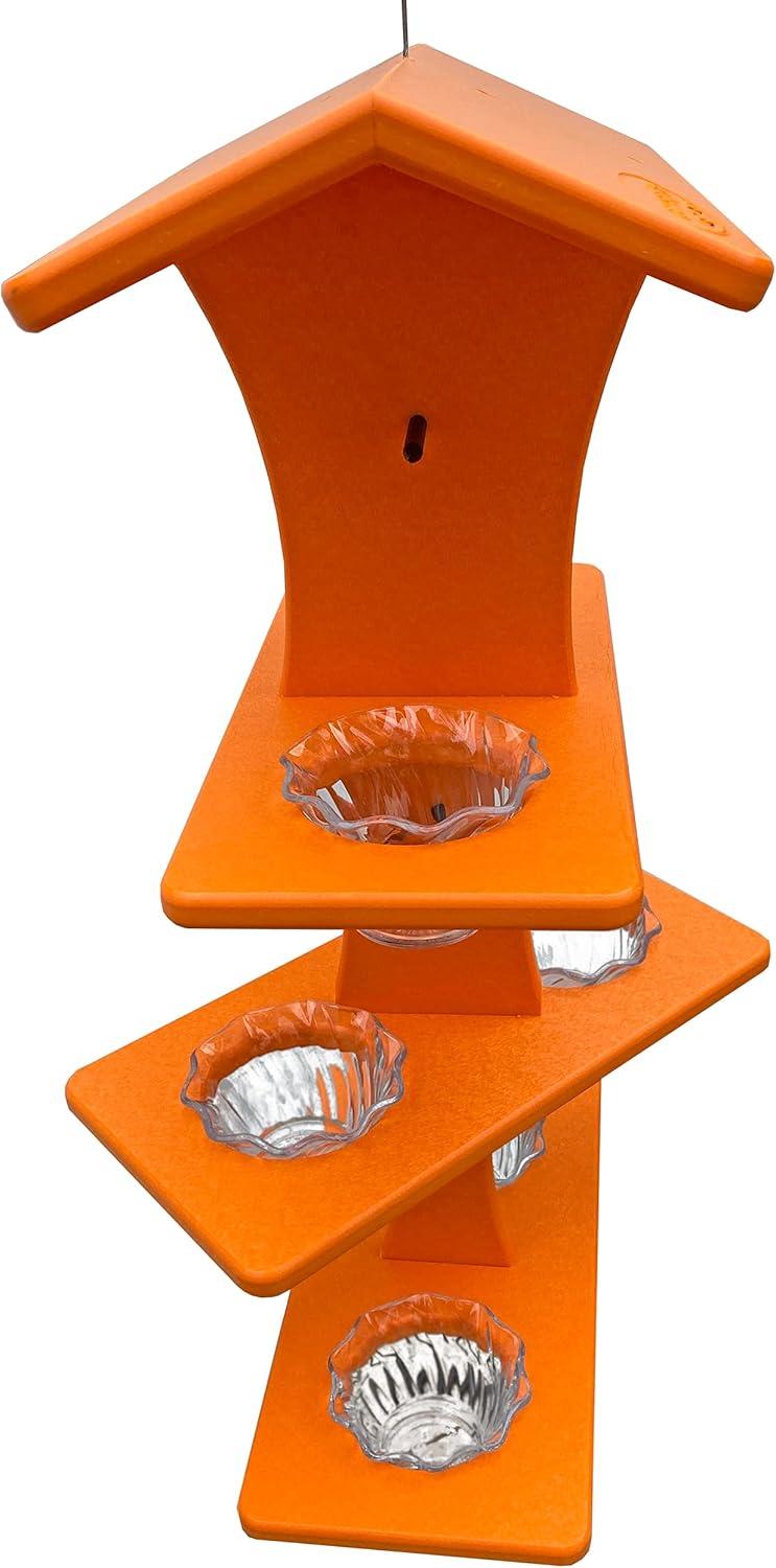 DutchCrafters Plastic Poly Double Platform Hanging Oriole Bird Feeder with Fruit Slice Holders & Nectar Cups, Jelly Bird Feeders for Outside – Amish Made in USA (Triple, Black & Bright Orange)(Bright Orange)