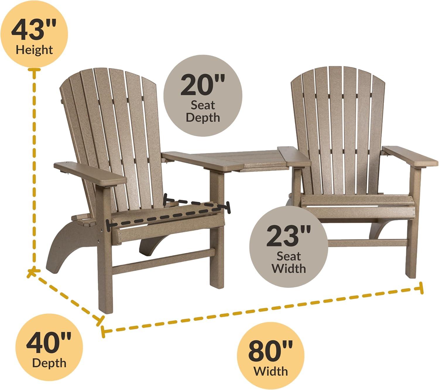 Stylish and Functional: Designed with comfort in mind, this poly Adirondack chair set of two is made with higher seats making getting in and out of the chair a breeze, unlike your standard Adirondack chairs. This settee loveseat comes with a removable center console table.