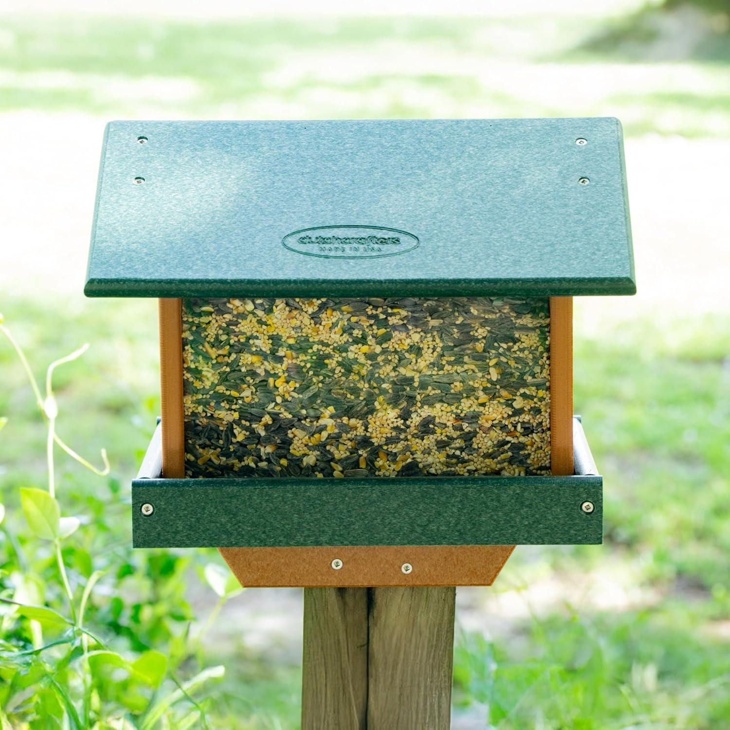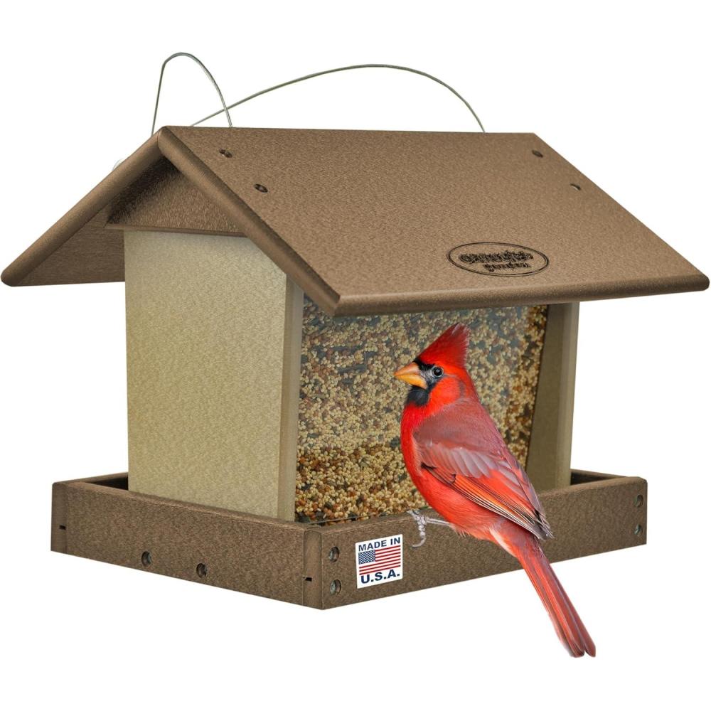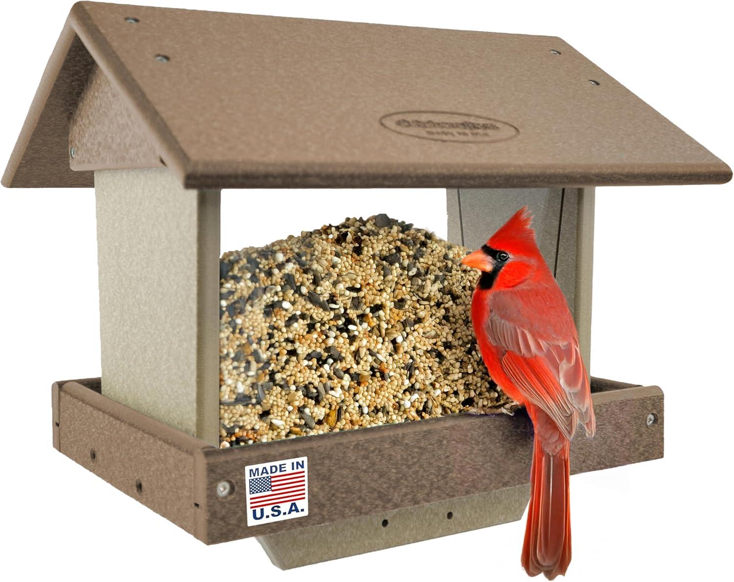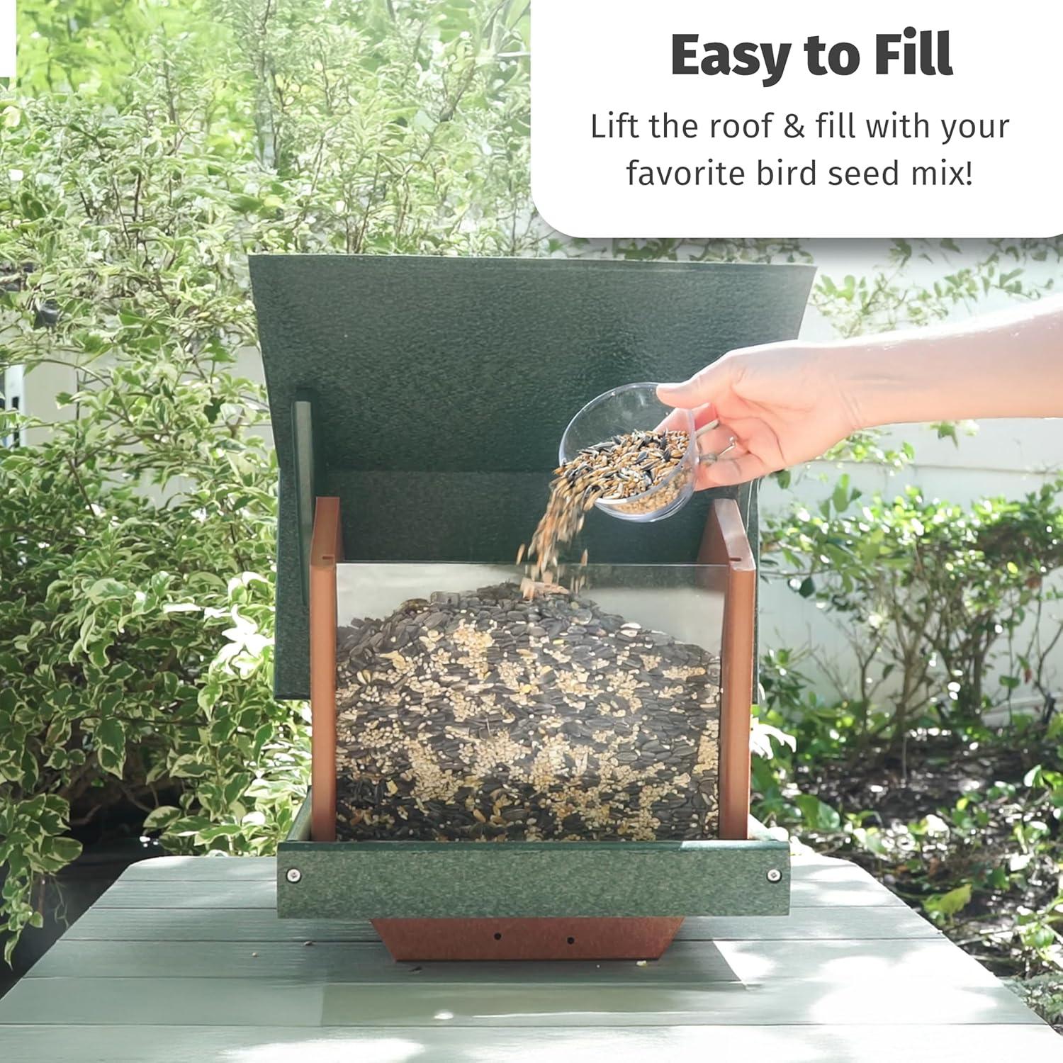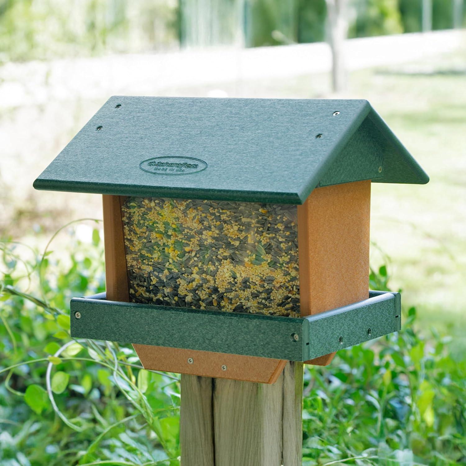 Heavy Duty Bird Feeder – Our hopper feeders for wild birds are crafted from HDPE recycled plastic poly lumber that is water resistant, making the covered bird feeder hopper durable and long lasting. Our recycled plastic bird feeder has an aluminum mesh tray for drainage, stainless steel hanging wire and hardware to prevent rust