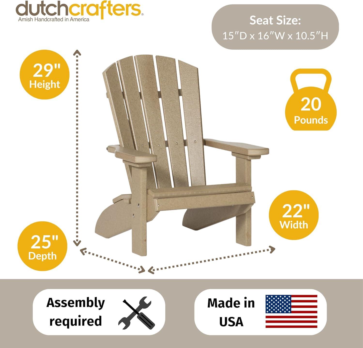 Give your child a durable and comfortable outdoor seat with the DutchCrafters Poly Kids Patio Adirondack Chair, designed specifically for children ages 3 to 8. Featuring a wide 22-inch seat and 25-inch depth, this outdoor patio chair provides plenty of room for growing kids to relax, play, or enjoy snacks in the backyard, on the patio, or at the beach. Crafted from weather-resistant, high-density polyethylene (HDPE), this all weather adirondack chair resists cracking, fading, and warping through all seasons. These kids lawn chairs are lightweight at 20 lbs. and are easy for kids to move around yet sturdy enough for everyday outdoor use. Its contoured seat and high back promote healthy posture, making this kids plastic chair comfortable for extended outdoor use. This kids lawn chair is perfect for outdoor playtime, reading, snacks, or relaxing by the pool or campfire. Designed as a comfortable kids lounge chair outdoor, it is durable enough to withstand active use by preschool and early elementary-aged children. Whether used as camping chairs for kids or as part of your kids outdoor furniture collection, this kids patio chair is a durable choice. Maintenance is simple — just wipe clean with mild soap and warm water using a damp cloth. There is no need for sanding, painting, or sealing, and the polywood adirondack chair is resistant to stains and weather damage, making it a low-maintenance choice for busy families. Available in bright, fade-resistant colors, this camping chair adds a playful pop to any outdoor space. Handmade by skilled Amish craftsmen in the USA, the DutchCrafters Plastic Adirondack Chair for Kids combines quality craftsmanship with modern, practical materials to offer your child a safe, comfortable, and visually appealing outdoor seat that will last for years to come. Whether placed on the patio, porch, lawn, or used as a beach chair, this kids outdoor chair complements any outdoor furniture setup with its classic Adirondack design.