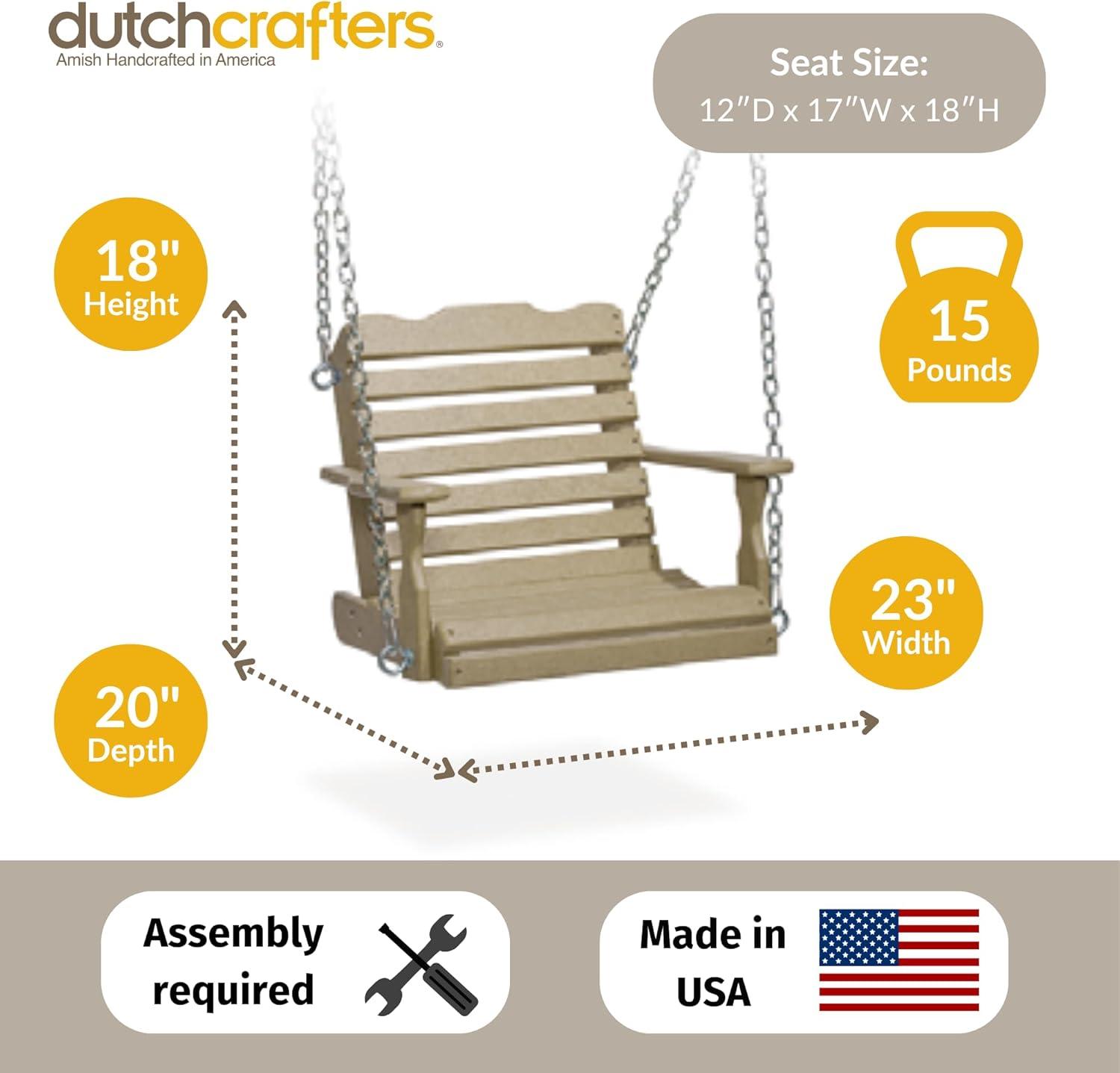 Encourage your little ones to step away from phones, tablets, TVs and other electronic devices and rediscover the simple joy of fresh air and outdoor play with the DutchCrafters Amish Made Childs Swing for Outside. Built to inspire hours of screen-free fun, this swing for backyard provides a safe and comfortable space where children aged 2 to 6 can laugh, imagine, and enjoy active play outside. In today’s digital age, getting kids outdoors is more important than ever, and this swing replacement helps make that transition easy and exciting. Crafted from durable, eco-friendly poly lumber, this child-sized swing for swing set is built to withstand all weather conditions. Available in 15 colors, this swingset swing offers plenty of choices to match your child’s personality and your outdoor décor. Made in the USA by skilled Amish artisans, every swing set swing reflects superior craftsmanship and attention to detail, ensuring you get a product that’s not only beautiful but long-lasting and safe for years of use. Whether you use our removable kids swings for outside as a hanging tree swing in the backyard or add swing attachments for swing set, the swing set swings child-size dimensions make it easy for young ones to climb in and out with confidence and independence. The play set swings are designed with safety in mind, giving parents peace of mind while kids enjoy their playtime outside. If you’re searching for a way to encourage your child to spend more time outside, away from screens, and engaged in healthy, active play, the DutchCrafters Single Swing for Kids is a great choice. Quality outdoor swings for kids are hard to find, but with DutchCrafters swing for swingset, you get lasting durability, comfort, and craftsmanship you can trust. Our kids swings for outside are a gift that brings lasting joy to your child’s backyard discovery accessories and encourages a lifetime of happy memories. Bring the park to your home with DutchCrafters kids outdoor swings today!