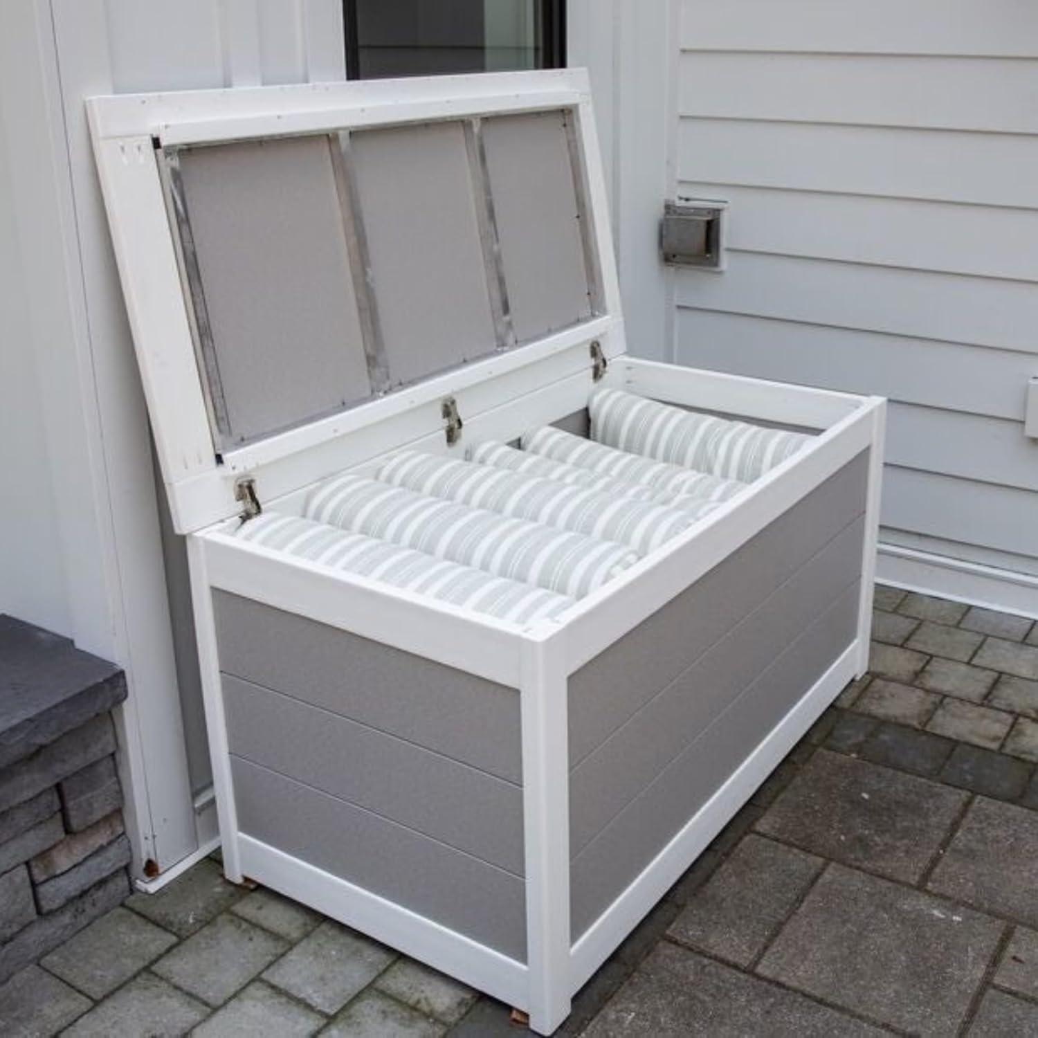 imageDutchCrafters Poly Waterproof Outdoor Deck Box 200Gallon Large Deck Box Weatherproof Storage for Pool Decor Porch Packages Pool Towel Holder Holds Up To 10 Cushions Gray ampamp WhiteBrown