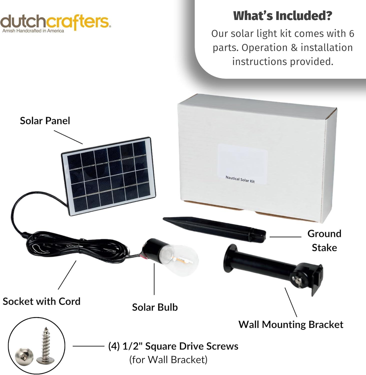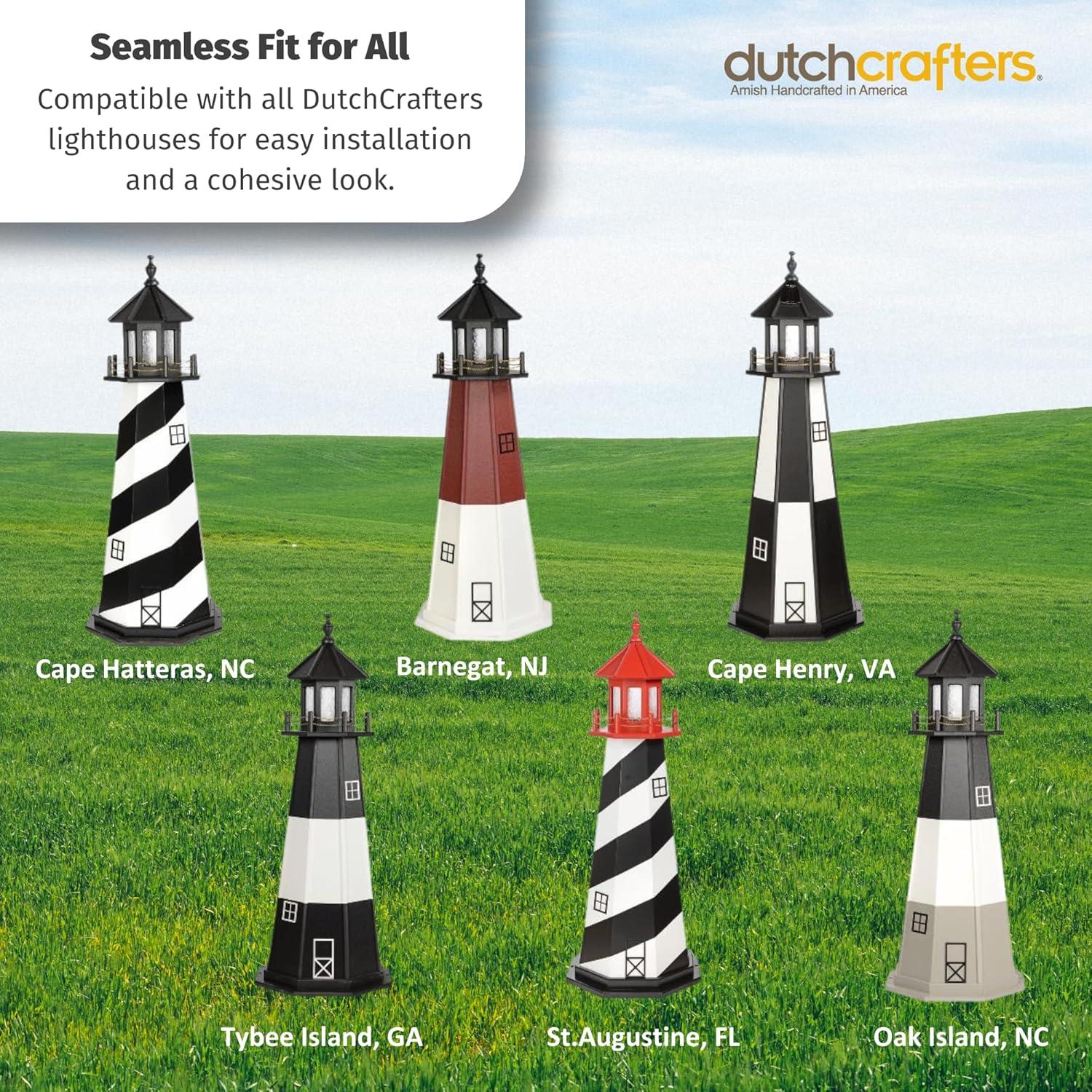Illuminate your outdoor space with the DutchCrafters Solar Powered Lighting Kit, a unique addition to your home decor. This Amish-made kit is a testament to the art of Amish furniture, offering both aesthetic appeal and practical functionality. Designed for lighthouse enthusiasts, our solar dusk to dawn lights kit serves as a perfect representation of light house decorations for home, capturing the essence of nautical decor with its authentic design. Crafted with precision, this solar light for lighthouse is compatible with all DutchCrafters lighthouses, ensuring a seamless integration into your existing decor. The LED light, featuring a separate on/off switch, provides reliable illumination while the built-in outdoor dusk to dawn sensor ensures automatic operation, conserving energy efficiently. The adjustable ground spike ensures stability, making it a sturdy addition to any outdoor setting. This lighthouse kit is not only a beautiful piece of solar garden lights but also a practical solution for illuminating your yard. As a solar-powered gadget, it eliminates the need for power essentials, making it a perfect fit for eco-conscious homeowners. Light house figures that light up your space. The DutchCrafters Solar Powered Lighthouse Kit is more than just a decorative piece; it is a statement of style and sophistication. Whether this garden light is placed in your backyard as part of your garden statues or as a centerpiece among your nautical decor, it adds a touch of the ocean to any outdoor decor. Whether you are enhancing your decorations for yard or looking for unique solar lights for your garden, this solar lighthouse light is the ultimate choice for those seeking quality and beauty. Perfect for creating a serene backyard oasis, this kit is a must-have for anyone who values both function and form in their outdoor patio decor.