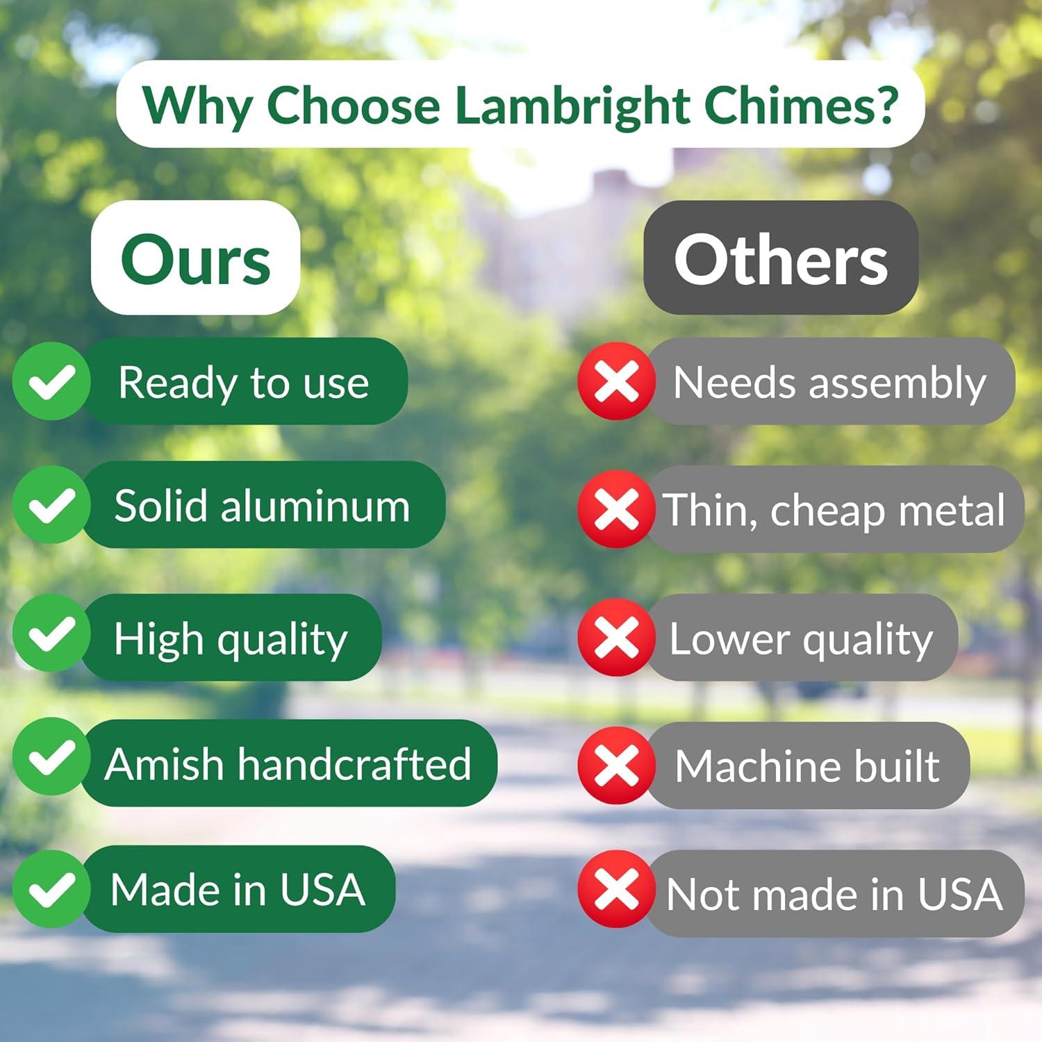 Handcrafted in the USA: Give a gift that lasts. Lambright Chimes combine traditional Amish craftsmanship with a durable, modern design, featuring rust-resistant, powder-coated aluminum tubes that stay beautiful in any outdoor setting. Unlike other gifts that are quickly forgotten, this timeless piece will be cherished for years to come.