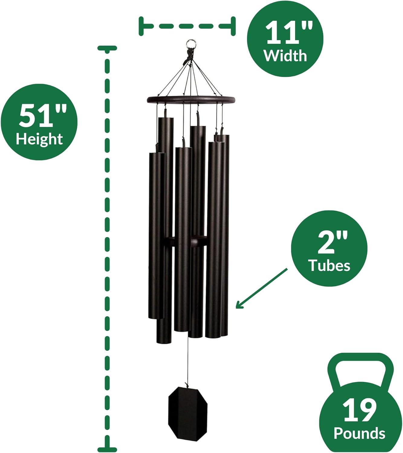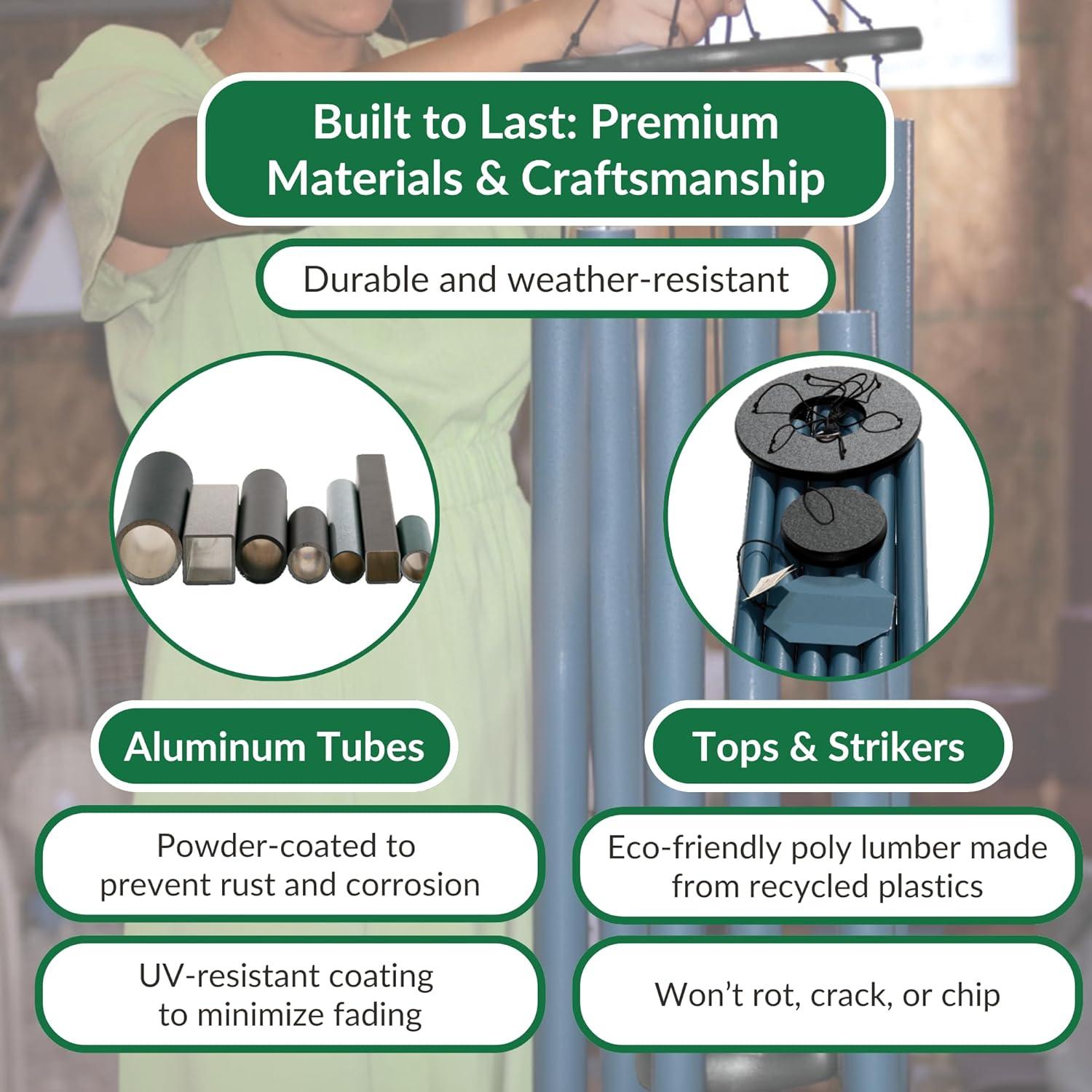 Features: This extra large wind chime measures 84 inches tall and has 2-inch round, powder coated aluminum tubes. Its top and striker are constructed from HDPE poly lumber, a weather resistant and eco-friendly recycled plastic material.