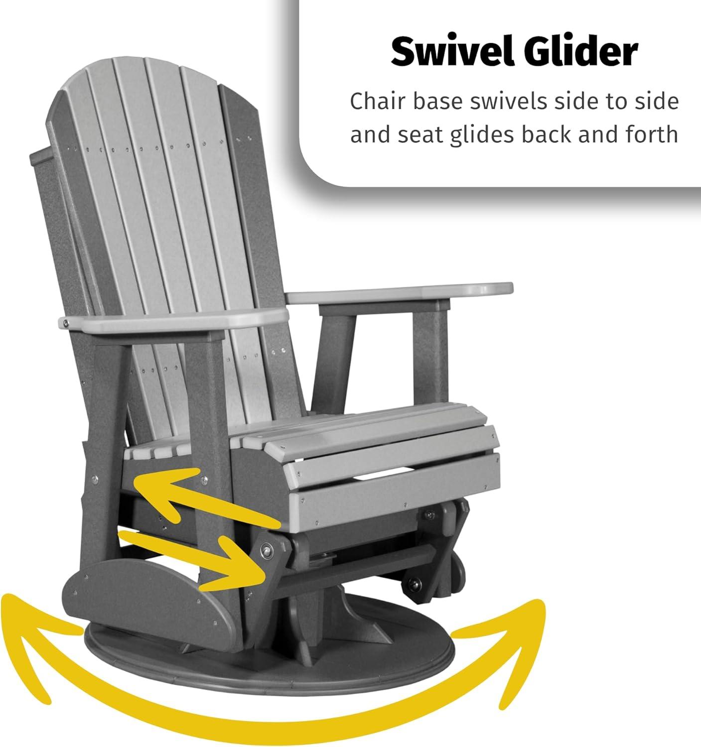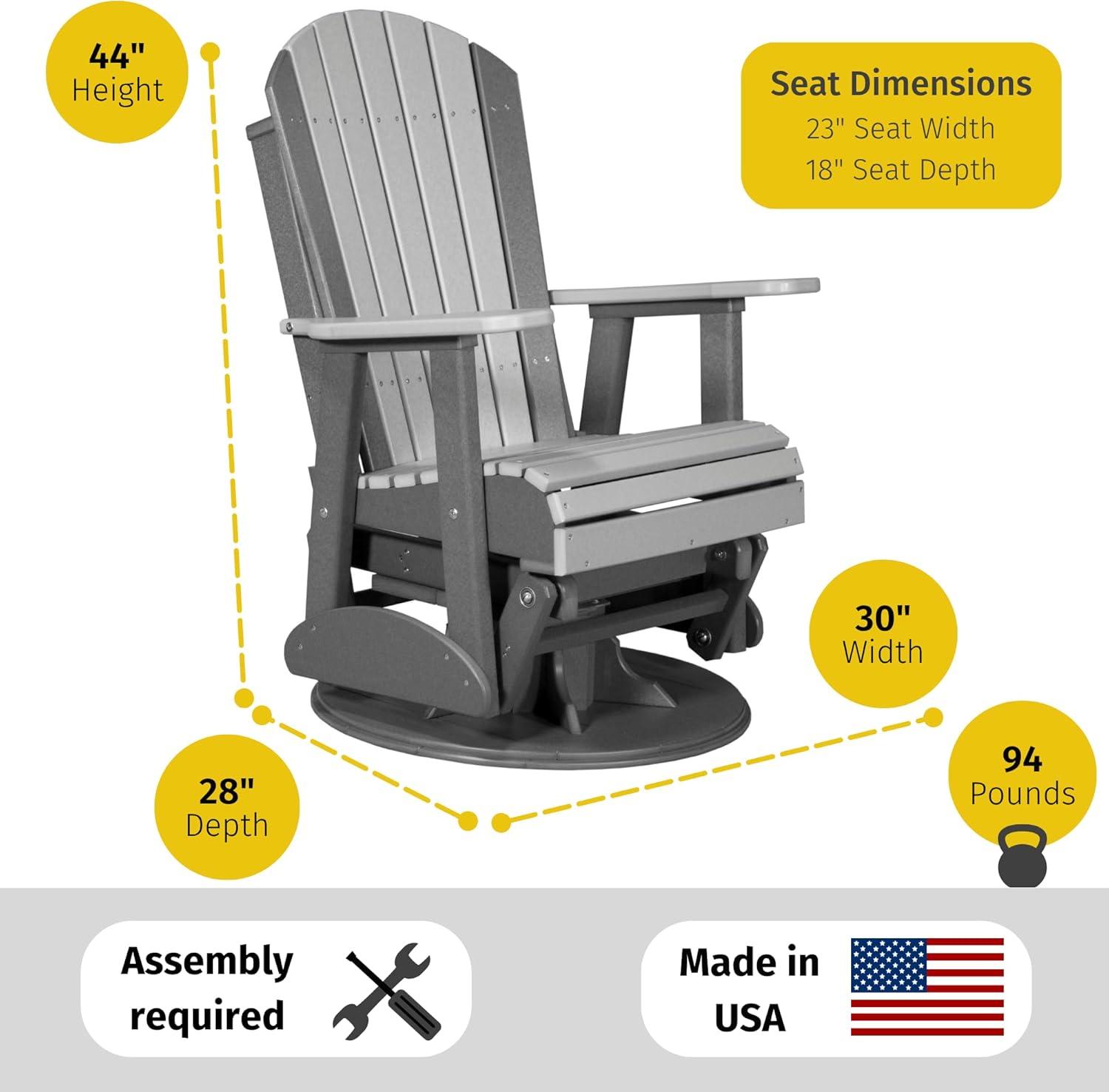 Enjoy what Mother Nature has to offer with this simple, yet elegant outdoor patio chair. The heavy duty base of the outdoor glider chair provides stability and a full 360 degrees of motion. LuxCraft swivel patio chairs feature a contoured seat and rounded edges that provide premium comfort. This swivel rocking chair also glides back and forth to melt the days stress away. Complete your outdoor space with outdoor swivel rocker patio chairs. Place these swivel outdoor patio chairs on your porch, patio or in your garden to create a fun and inviting entertainment space for family and friends. — Dimensions – Overall: 30″W x 28″D x 44″H, Seat: 23″W x 18″D, Weight: 94 lbs. Assembly is required, however, instructions are included for easy assembly. — Made from poly lumber (HDPE) a plastic made from post-consumer recycled waste like milk jugs and laundry bottles. This plastic is melted and pressed into dense boards that can be used as a building material, such as outdoor furniture. Our poly is 90% recycled plastic by weight, so you can feel good about your poly furniture. Poly is also exceptionally resistant to splintering, warping, moisture and many other environmental factors. Built with UV stabilized pigments to minimize fading through sun and weather exposure. — LuxCraft products are backed by a limited lifetime residential warranty, and a 5-year limited commercial warranty. Defective and non-conforming products or parts are replaced at no cost to you. Contact our sellers for more information.