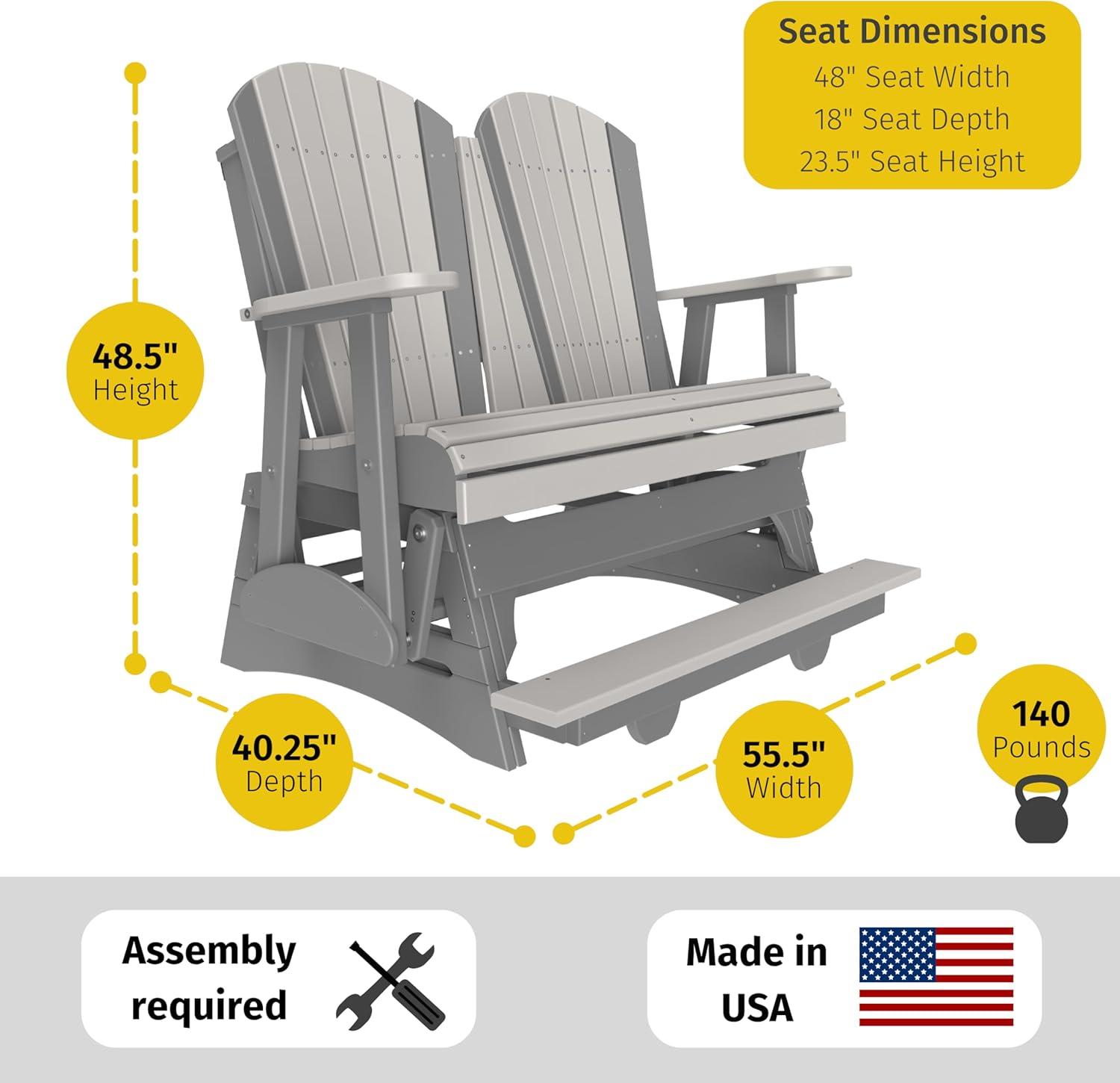 LuxCraft 4' Adirondack Balcony Outdoor Glider Bench for Outside Patio, Porch Glider Loveseat for Two, HDPE Poly Gliders, Raised Seat & Built-in Footrest - USA Amish Made (Weatherwood & Black)(Brazilian Walnut & Black)