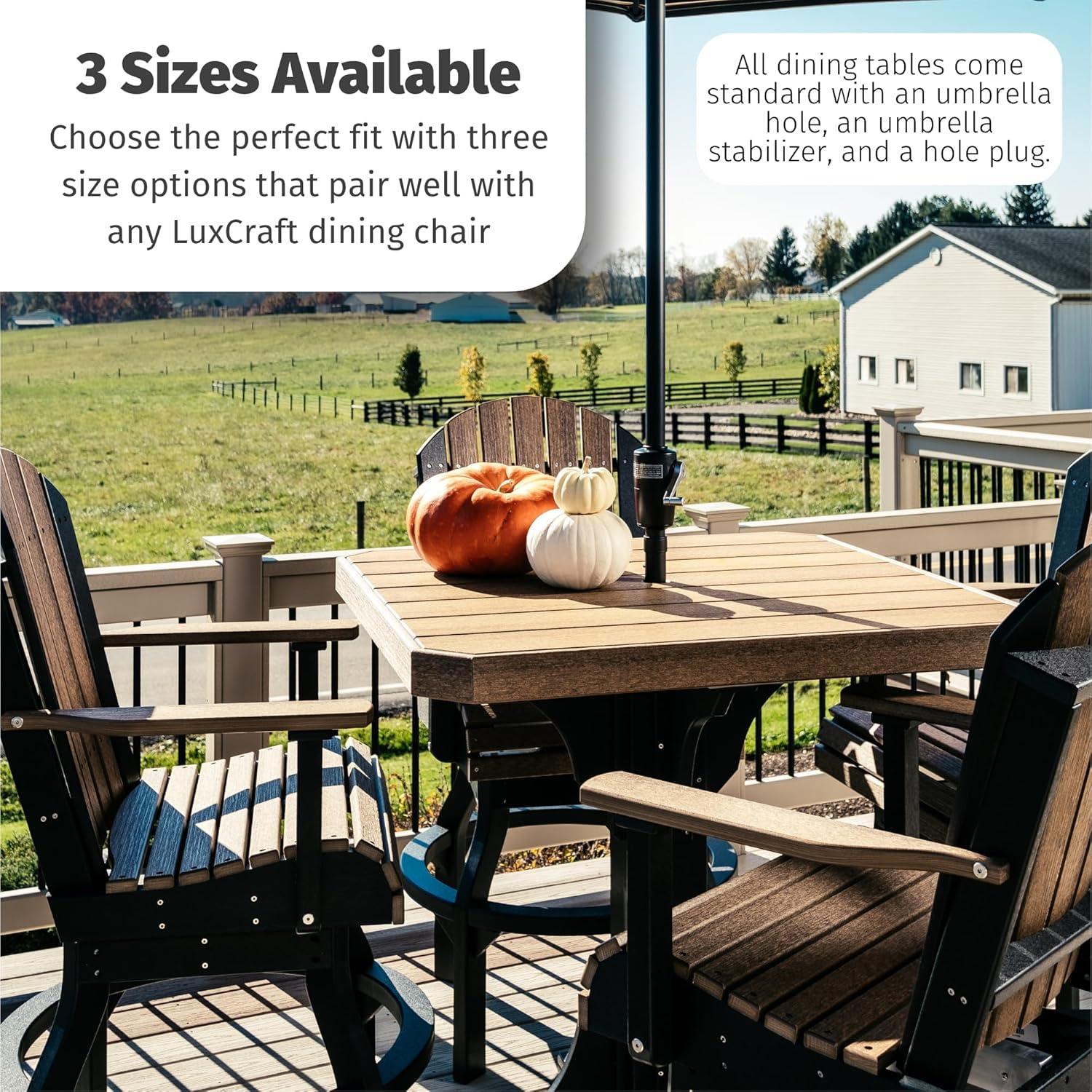 Pairs Beautifully with LuxCraft Outdoor Furniture – Make it a complete patio dining set with any of LuxCraft's dining chairs, 41″ Cafe Dining Bench and the LuxCraft 9 Foot Patio Umbrella. The built-in umbrella hole, stabilizer, and plug accommodate most patio umbrella styles, giving you reliable shade and sun protection in seconds. Designed to match in color and material, each poly piece complements this square outdoor table perfectly to create a cohesive patio dining area.