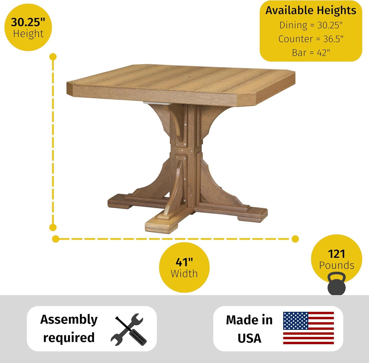 The LuxCraft 41″ Poly Square Dining Table is where lasting craftsmanship meets timeless style. Expertly handcrafted in the USA by skilled Amish artisans, this HDPE dining table is part of the renowned LuxCraft furniture collection that offers a stunning combination of strength, style, and sustainability. Whether you're setting the stage for a peaceful dinner for two or curating a complete patio dining table for 4, these square patio tables are a standout addition to any outdoor space. LuxCraft outdoor dining tables are available in a palette of stunning bold or neutral colors, allowing you to select the shade that best complements your existing patio set or hdpe furniture. The patio dining tables sculpted single pedestal base adds a touch of elegance, while the squared top provides ample space for dining and entertaining outdoors. One of the standout features of this hdpe outdoor table is its customizable height options. Choose from standard dining height (30 1/4″), counter height (36 1/4″), or bar height (42″) to suit your specific dining needs. This flexibility ensures that the outdoor adirondack table fits seamlessly into your outdoor patio dining setup, whether you're furnishing a patio bistro set or an expansive patio dining table for outside gatherings. Made from high-density polyethylene (HDPE), this outdoor dining table with umbrella hole is celebrated for its weather resistance and low maintenance. With just a simple wash with soap and water, your poly patio table will remain pristine through every season, eliminating the need for frequent upkeep. This outdoor square table is designed with practicality in mind, featuring an umbrella hole for easy integration with a patio umbrella table setup, perfect for sunny afternoons. Assembling your new poly furniture might require a little effort, but the process is straightforward and well worth the result: a stunning 42 square table of your choice that enhances your outdoor dining experiences