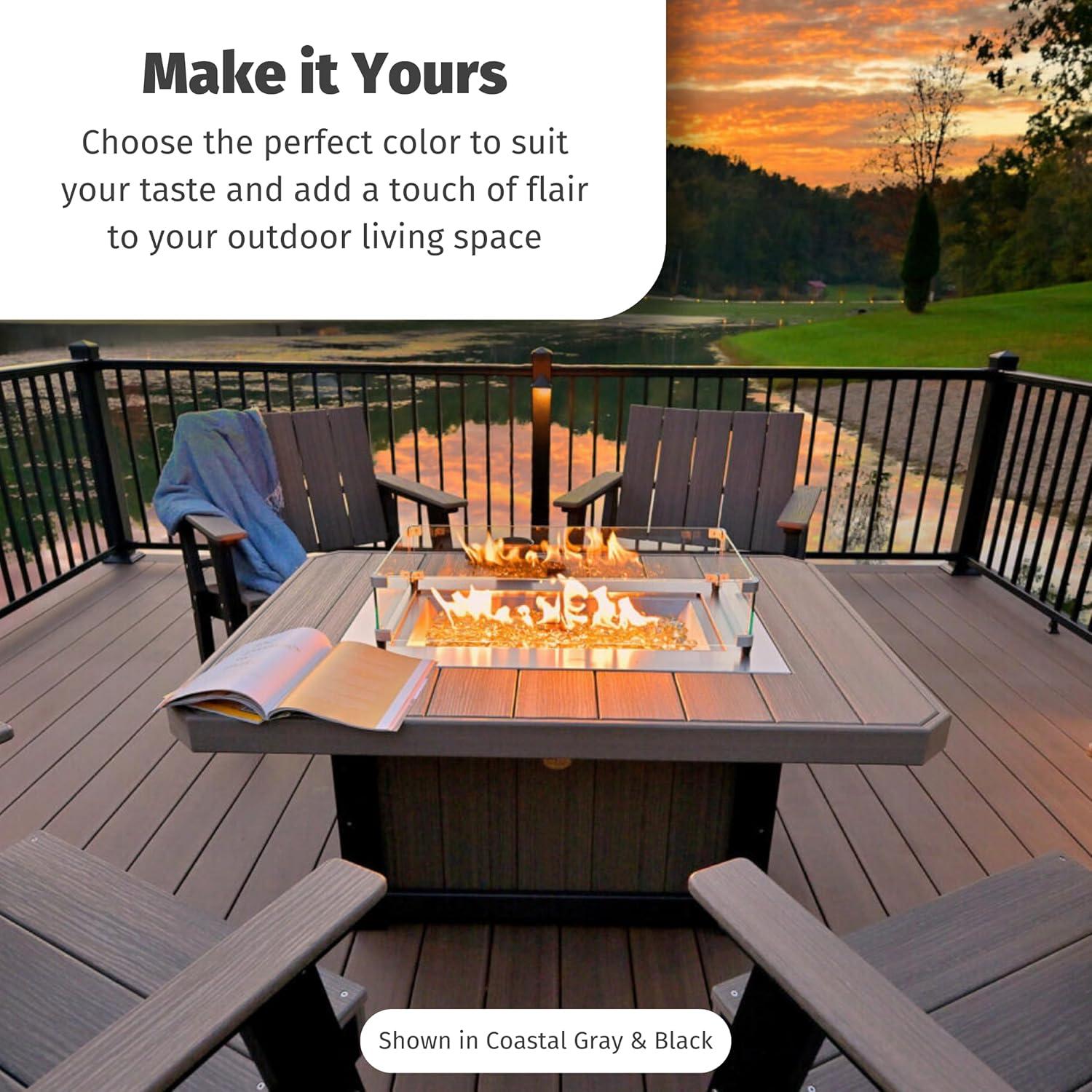 Built to Last – Crafted from durable, weather-resistant HDPE poly lumber, this propane firepit table for outside patio is built to last. Our outdoor gas fire pit coffee table features stainless steel hardware that lasts longer than cheap metal hardware
