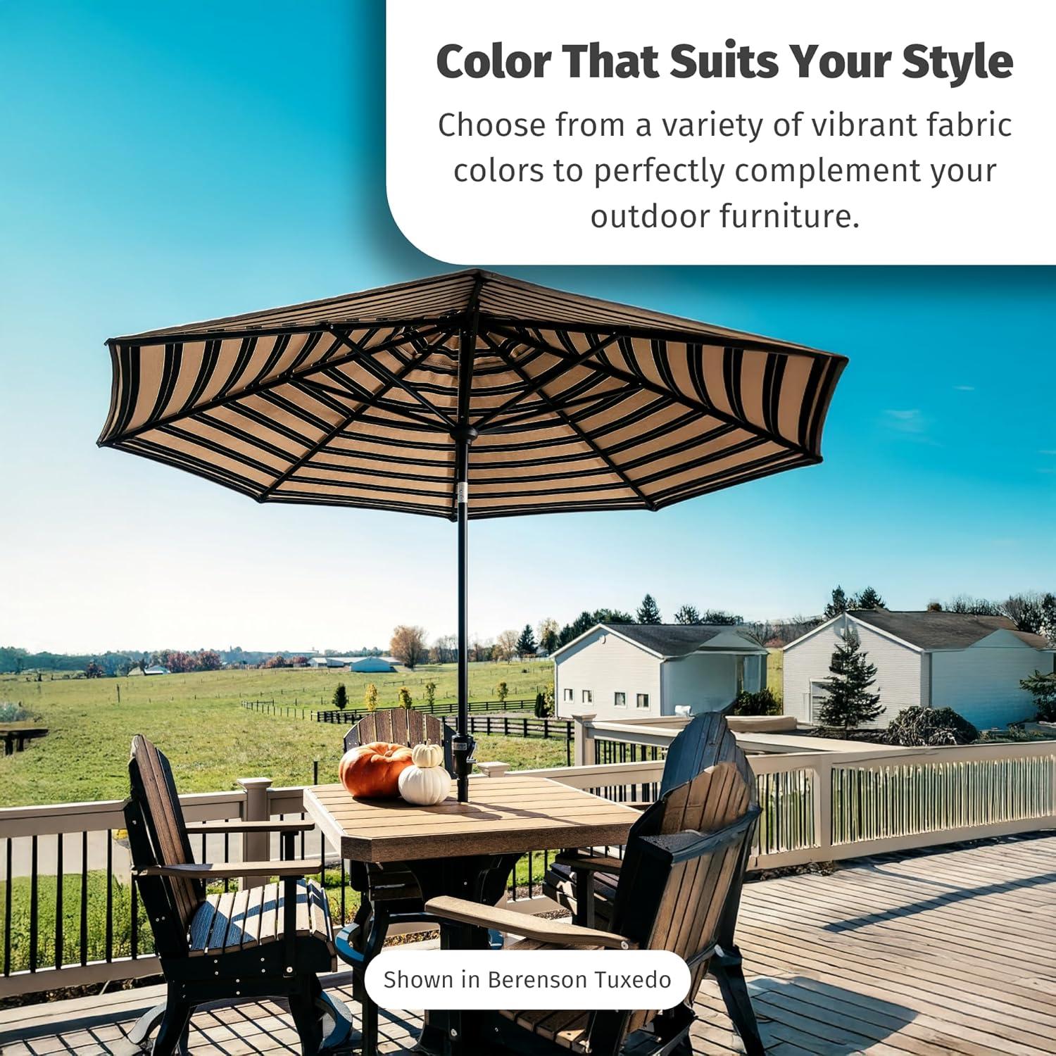 The LuxCraft 9' Outdoor Umbrella is a stylish and durable solution for sun protection across patios, balconies, gardens, and pool decks. Whether you're relaxing in the backyard, dining on the balcony, or entertaining by the pool, our tilting outdoor umbrellas for patio deliver style, shade, and long-lasting performance. Crafted with a high-quality powder-coated aluminum Treasure Garden frame and premium fabric, this outdoor patio umbrella is built to withstand sun, wind, and rain. The UV-stabilized material is fade, water, and stain-resistant, making it an ideal sun umbrella for multiple outdoor settings like a firepit table, umbrella patio table, or backyard bar table. It’s also easy to clean, ensuring your outdoor umbrella looks vibrant year after year. The umbrella canopy replacement is simple, ensuring you can enjoy your outside patio space with fresh, vibrant coverage for years to come. The canopy easily opens with a crank and features a push-button tilt mechanism, allowing you to adjust your outdoor umbrella for patio use throughout the day. Whether you're shading an outdoor fire pit, a backyard patio, or a table umbrella outdoor patio arrangement, this tilting outdoor pool umbrella adapts to your needs with comfort and convenience. Available in a wide selection of bold solid colors and two-tone striped designs, including a black and white patio umbrella, yellow patio umbrella or orange patio umbrella, this versatile piece for umbrella table complements any patio garden, balcony garden, or outdoor garden. From the pool deck to the lawn garden, the LuxCraft 9ft sun umbrella is more than just a stylish addition—it’s a smart investment in outdoor shade and worry-free outdoor living.