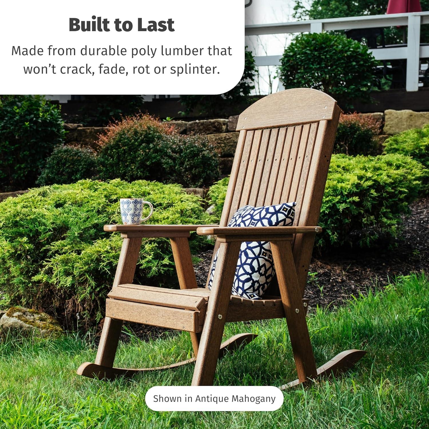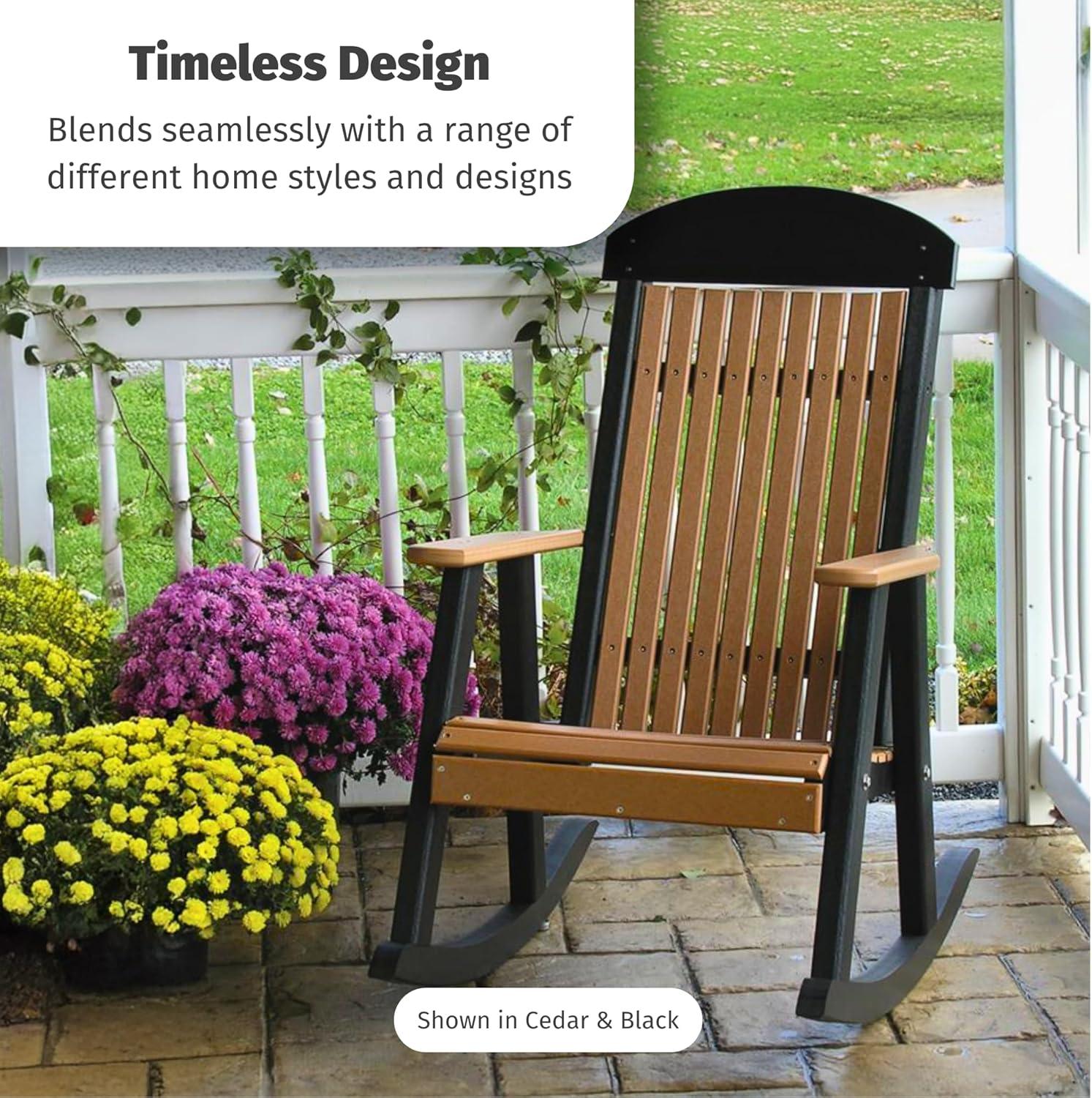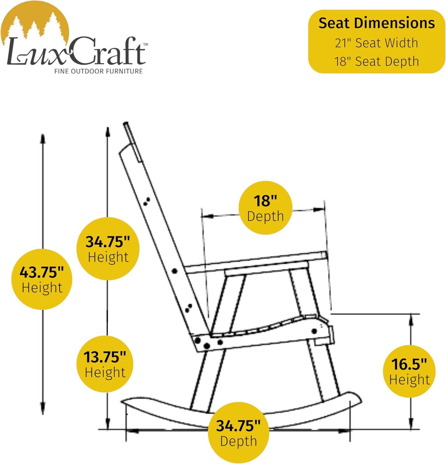 The LuxCraft Poly Rocker is an investment in comfort, durability, and style, designed to enhance any outdoor space. Our porch rocking chairs are crafted from poly lumber, a recycled plastic resin made from consumer waste such as milk jugs and laundry detergent bottles. This rocking lawn chair is both eco-friendly and built to last for years to come. It resists cracking, fading, and rotting, making it perfect for year-round outdoor use without the need for constant up-keep. Simply clean it with soap, water, and a soft bristle brush, and it will look as good as new for years to come. Its ergonomic straight back and slanted seat provide excellent support for your posture, while the extra-long rocking rails deliver a smooth, steady motion perfect for relaxing and unwinding in your patio furniture. The 20-inch seat height makes it easy to get in and out of the chair, ideal for adults of all ages. Add a classic black rocking chair to your outdoor patio or other neutral colors such as white, chestnut brown, weatherwood and dove gray. The LuxCraft Poly Rocker can easily match your existing Adirondack outdoor furniture and deck chair set. For those seeking a more refined look, premium wood grain finishes are available at a higher price point. Proudly made in America, this porch rocker is not only a high-quality product but also supports local craftsmanship. The residential lifetime limited warranty and commercial 5-year limited warranty offer peace of mind, ensuring your investment is protected for years to come. Whether placed on your front porch, patio, or in your garden, this durable and low-maintenance outside rocking chair creates a comfortable, stylish spot for you to enjoy relaxing moments, whether reading, sipping a drink, or simply enjoying the outdoors. LuxCraft Outdoor Rockers aren't just furniture—these are a long-lasting, eco-friendly lifestyle upgrade that invites you to relax, entertain, and enjoy the beauty of your surroundings.