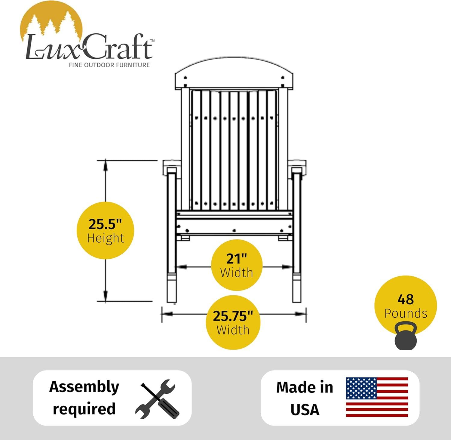 Dimensions – Our porch rocking chair measures 25.75″ width x 34.75″ depth x 43.75″ height. Seat – 21″ seat width x 18″ seat depth. Weight – 48 pounds. The LuxCraft patio rocker ships unassembled, and assembly is required. Stainless steel hardware and assembly manual are included.