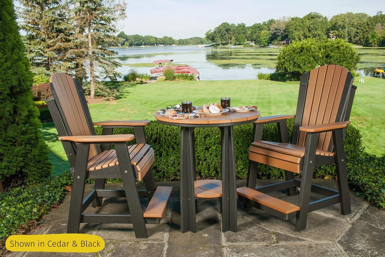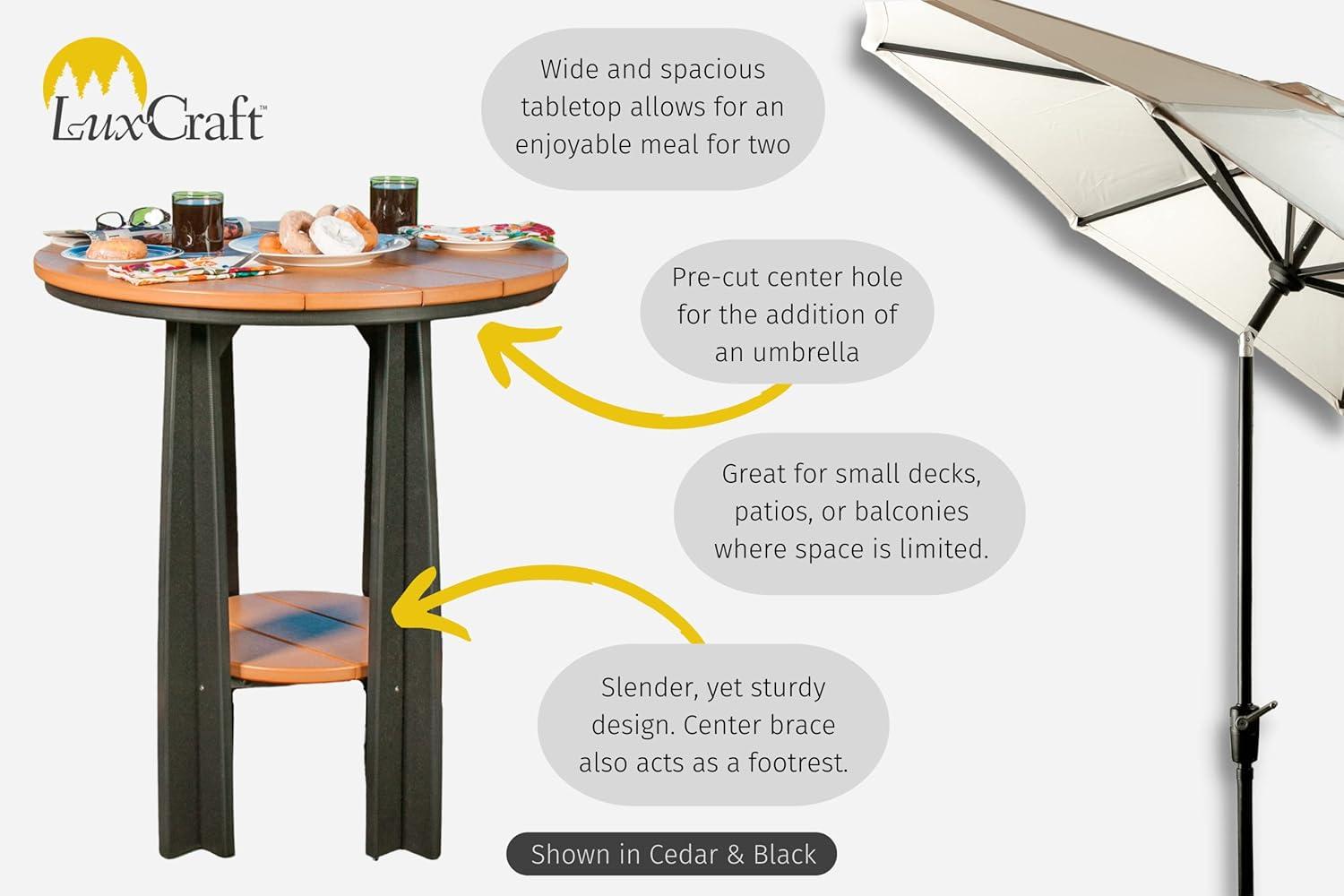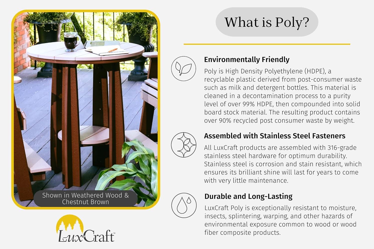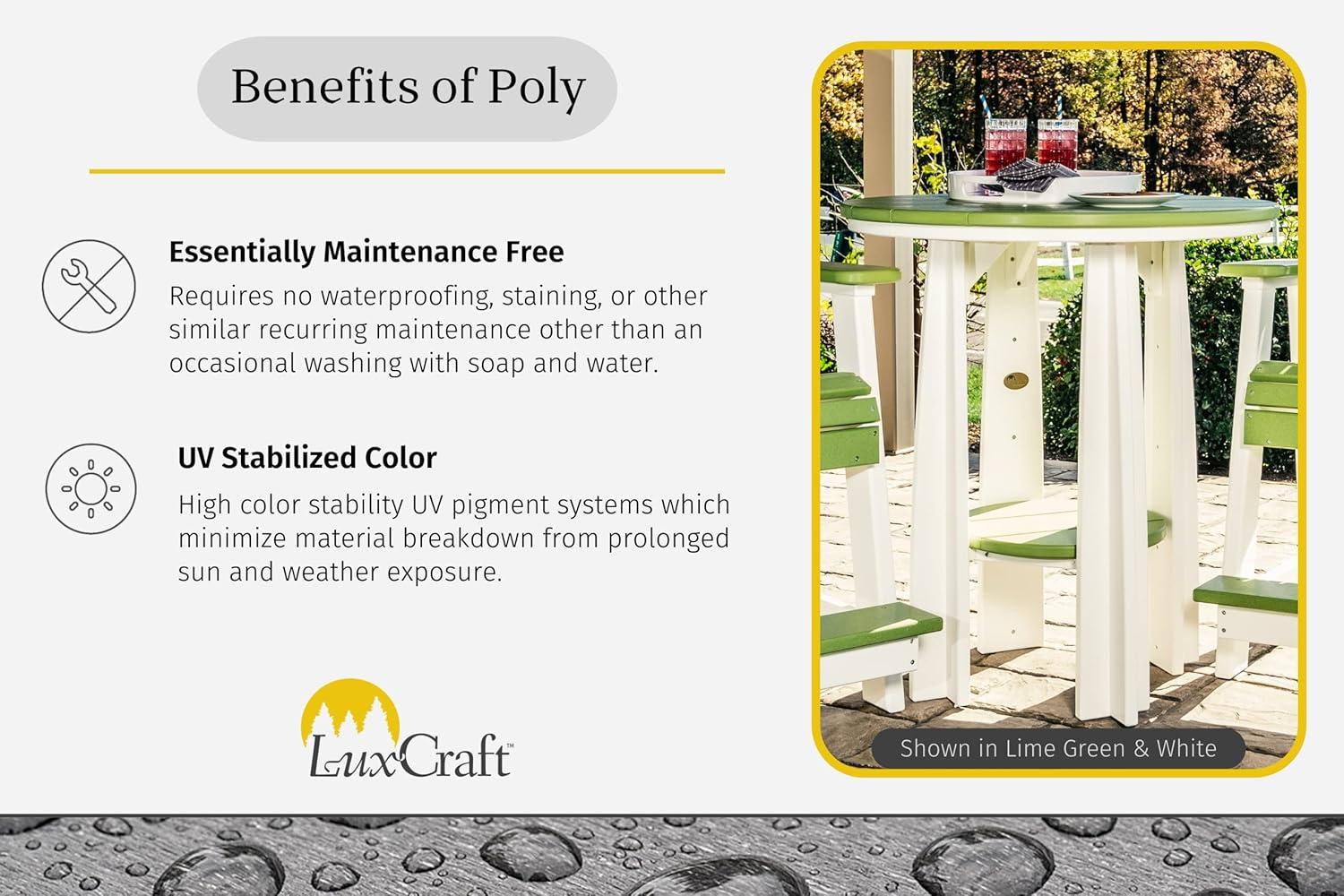 Enjoy the gentle breeze and cooling shade underneath your umbrella at your LuxCraft counter height table. Our outdoor dining table features a 32.5″ round tabletop with a built in umbrella hole for added convenience. Standing 36″ tall, this round table is counter height and pairs well with the balcony dining chairs. Add up to four chairs around the 32.5″ balcony table. Set your feet up on the lower shelf and relax in style and comfort. Made from durable poly (HDPE) a dense plastic resin made from laundry and milk bottles that are cleaned, melted and pressed into long boards. These poly boards are then cut and assembled into outdoor products. Poly is a great alternative to wood as it is exceptionally resistant to rot and wear. Poly is also very low maintenance, only requiring occasional washing with LuxCraft Poly Furniture Cleaning Kit or with a mild soapy water solution. Rest assured knowing your LuxCraft poly outdoor furniture will last through many seasons of enjoyment. Overall Dimensions: 32.5″ Width x 32.5″ Depth x 36″ Height, 71 lbs.