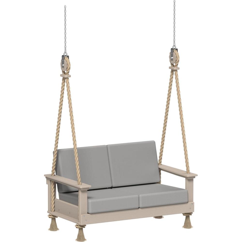 Create a peaceful, relaxing atmosphere with LuxCraft loveseat porch swings, that is sure to become the hangout spot of your outdoor entertainment space. Enjoy summer evenings or cool fall night fires cozied up on the soft outdoor cushions. Standard with rope chain that adds a touch of rustic charm to the modern appearance of the swing. Pair with the LuxCraft deep seat cushion outdoor furniture collection to complete the look. Crafted from heavy duty HDPE poly lumber, this outdoor swing bench is built to handle the elements. Weather-resistant zippered cushions are very low maintenance. Crafted from durable, water and stain repellent fabric that is designed to stay beautiful over time. Our deep seat patio furniture is built with durable materials and assembled with stainless steel hardware. Patio swing bench dimensions: 59″ width x 34″ depth x 29″ height – 17″ armrest height – 50″ seat width x 23.5″ seat depth x 10.75″ seat height – 72″ rope length, 54.75″ rope center distance, 44″ chain length – 159 pounds. Assembly instructions and allen key included, 1/2″ wrench required (not included)
