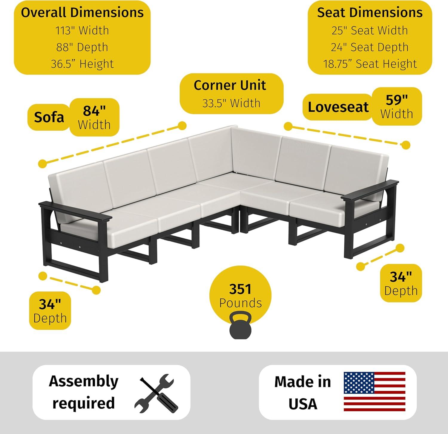 LuxCraft Poly Lanai Deep Seat 3-Piece L-Shape Outdoor Patio Sectional Furniture Set, Modular Modern Outdoor Sectional Sofa Set - USA Amish Made (Black, Canvas Fabric)(Black Spectrum Dove Fabric)