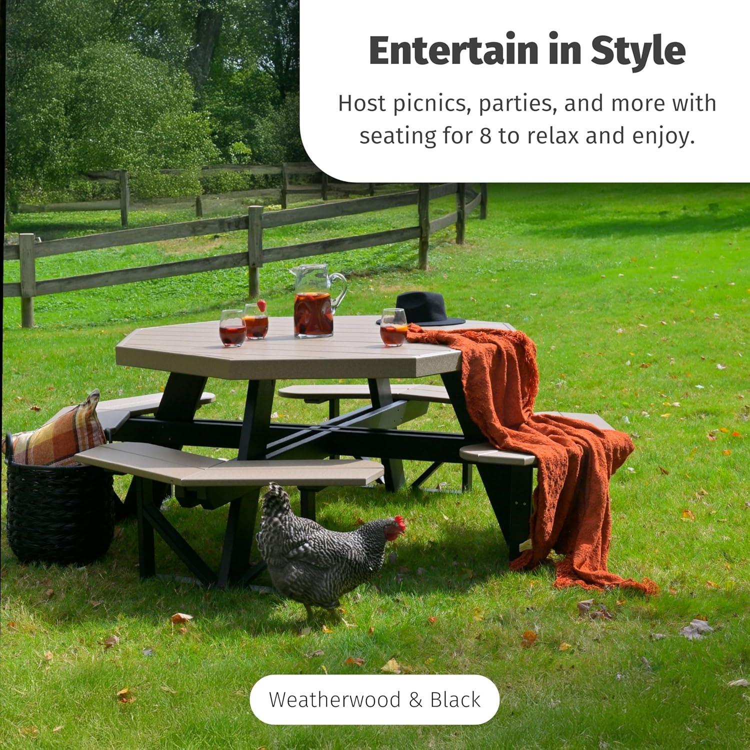 LuxCraft Poly Octagon Picnic Table - Outside Table for Adults & Kids, Seats 8, UV Resistant and Heavy Duty, Durable Outdoor Furniture, Amish Made in USA (Cedar & Black)(Weatherwood)