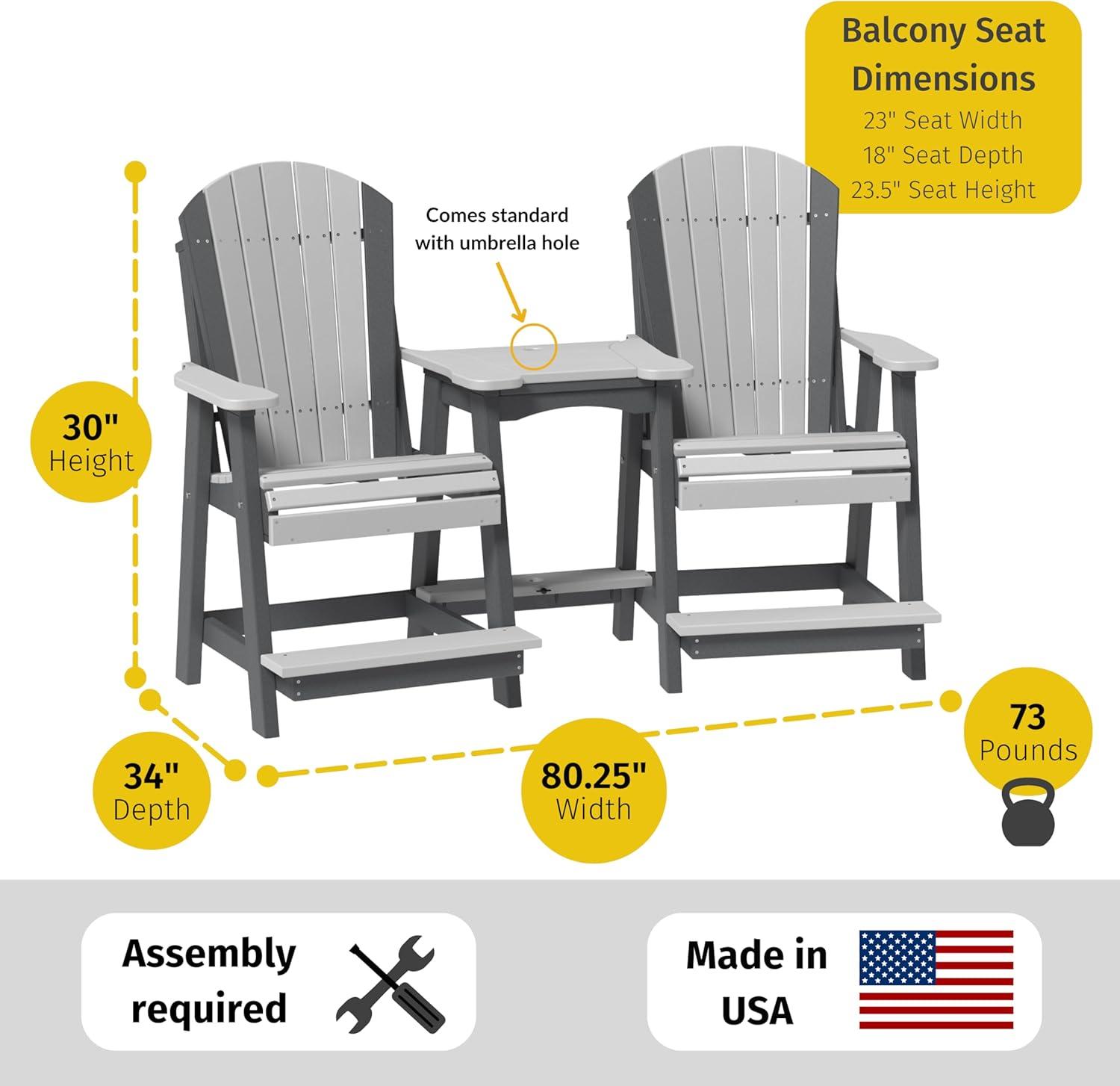 Connected Conversations – Experience intimate outdoor moments with the LuxCraft Tete-a-Tete Balcony Set, a duo of counter-height Adirondack chairs seamlessly connected by a built-in table. Ideal for small balconies, patios, or porches, this set is designed for comfort and connection. The connecting outdoor table creates a shared surface for coffee, snacks, books, drinks, or other poolside necessities. Add up to two LuxCraft Stationary Cupholders for additional cup holders or insert the LuxCraft 9 Foot Patio Umbrella using the integrated center hole for customizable shade throughout the day (sold separately).