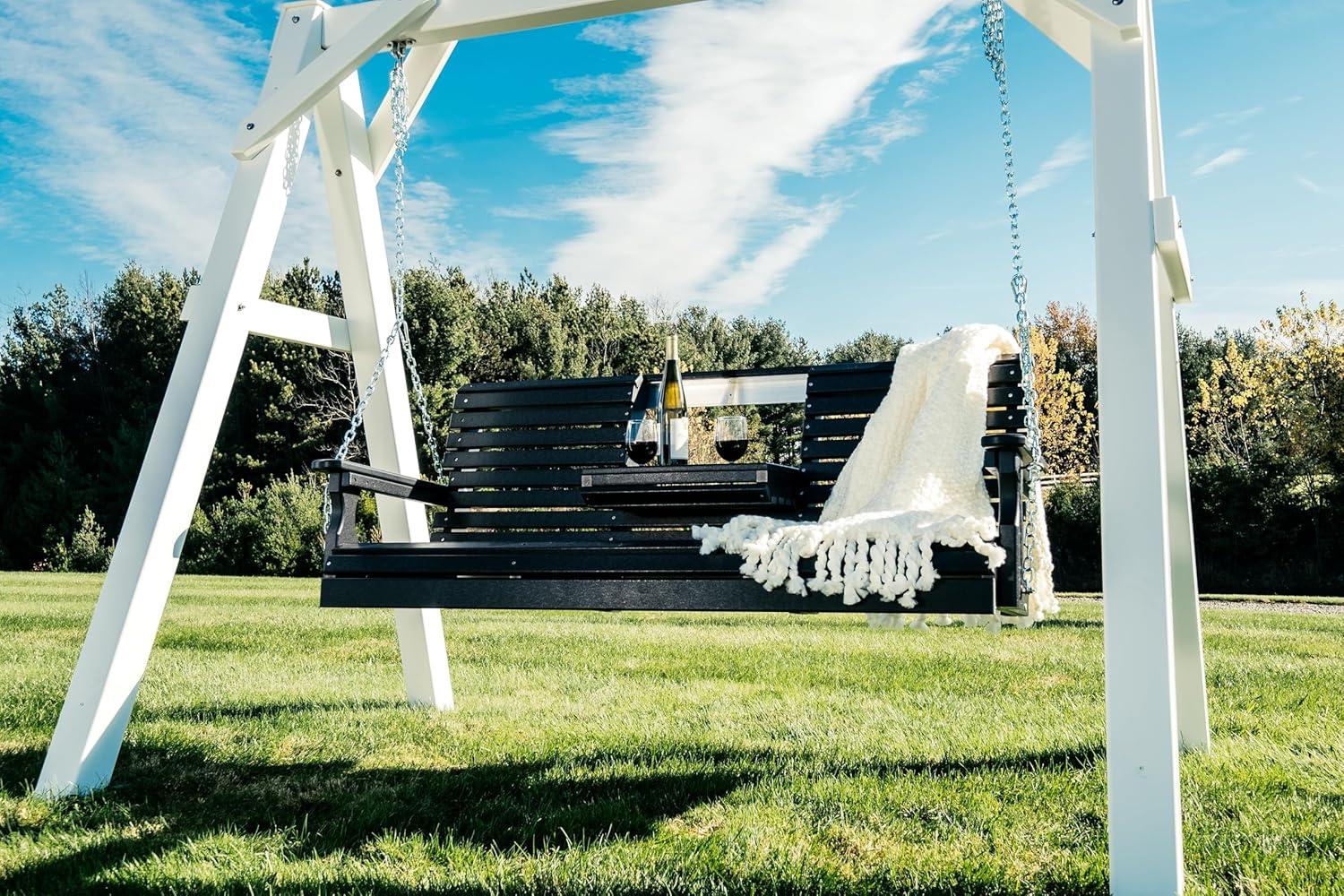 LuxCraft Rollback 5ft Recycled Plastic Plain Porch Swing with Flip Down Center Console(Black)