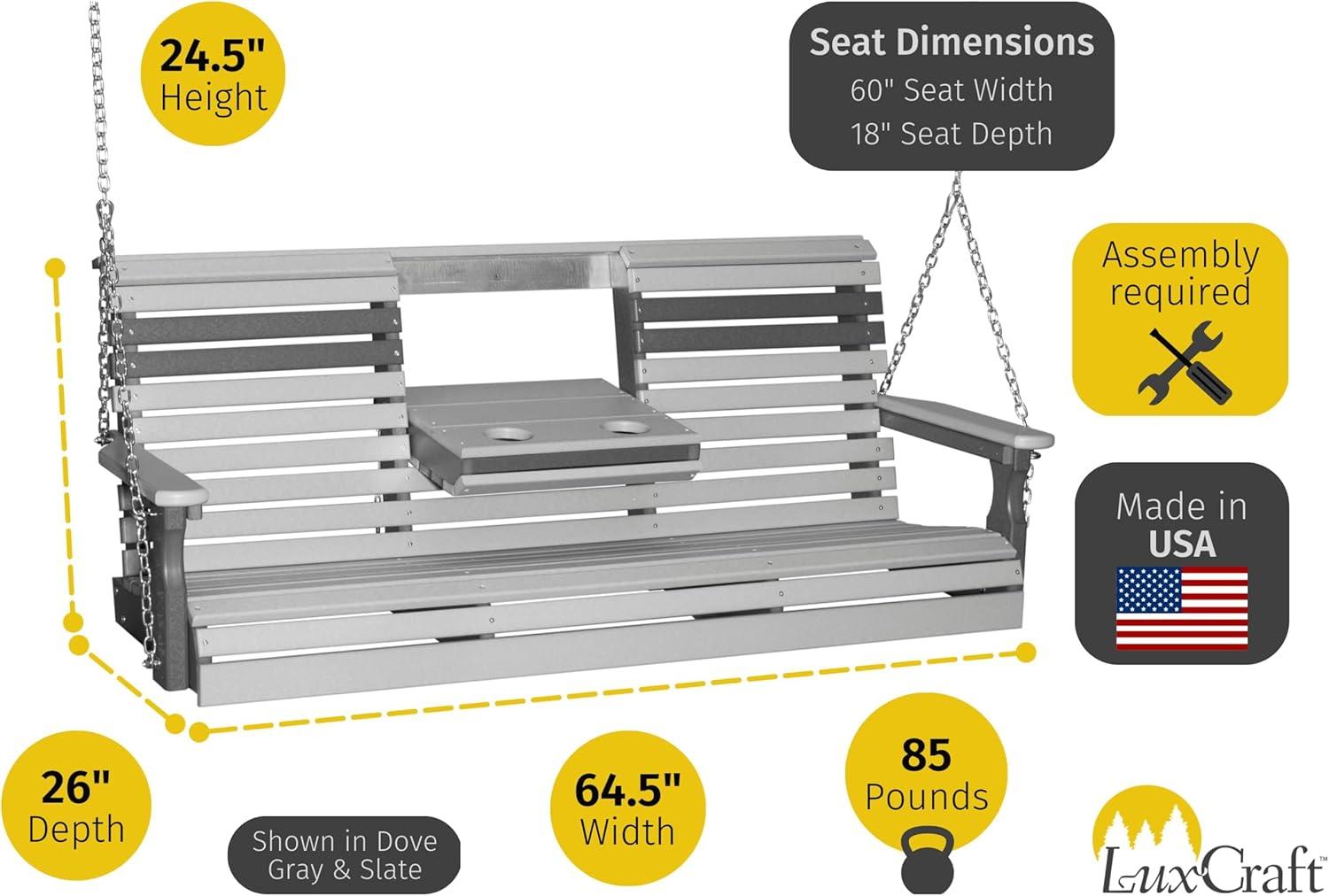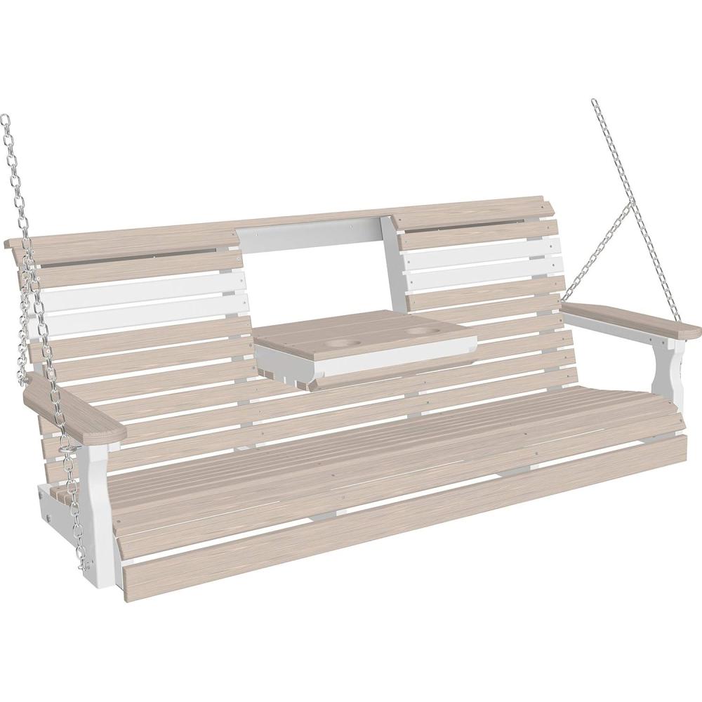 LuxCraft Rollback 5ft Recycled Plastic Plain Porch Swing with Flip Down Center Console(Birch & White)